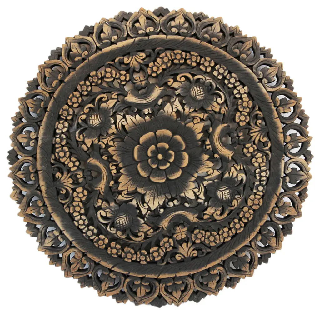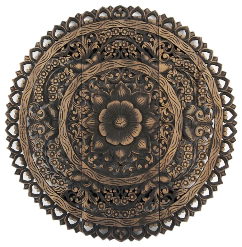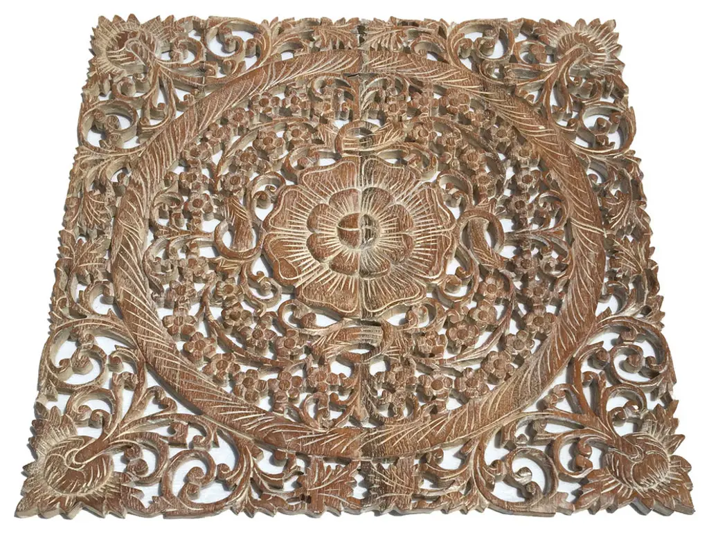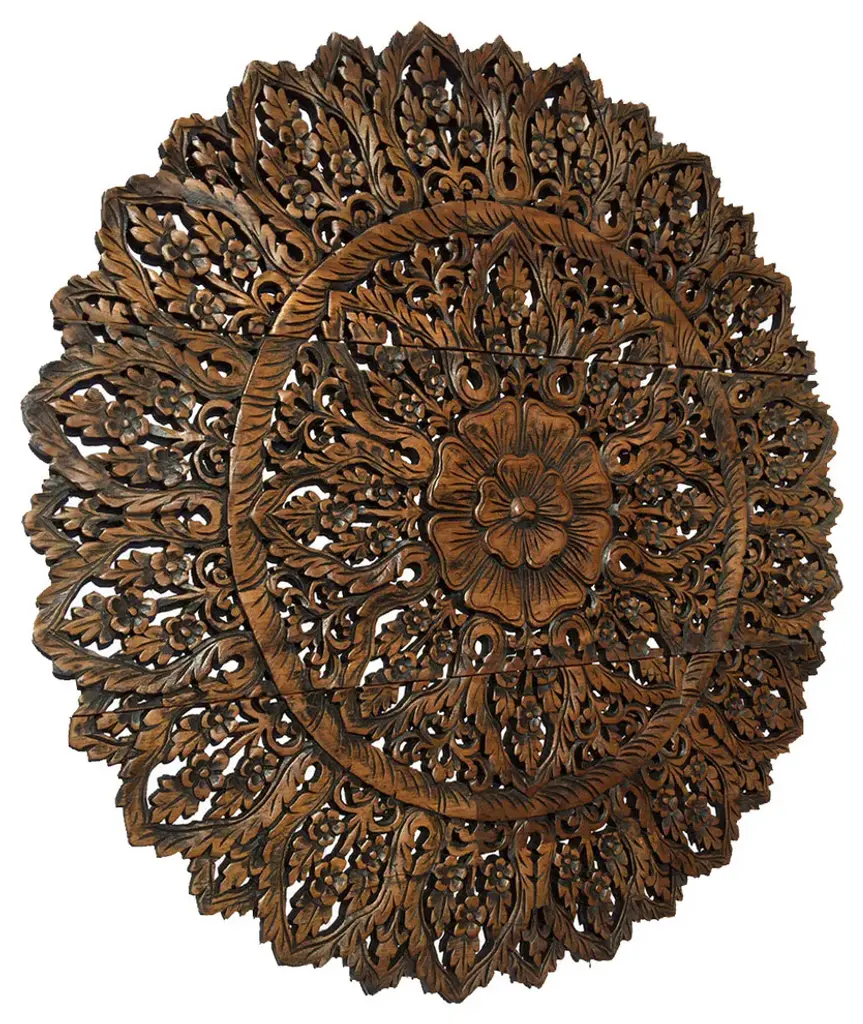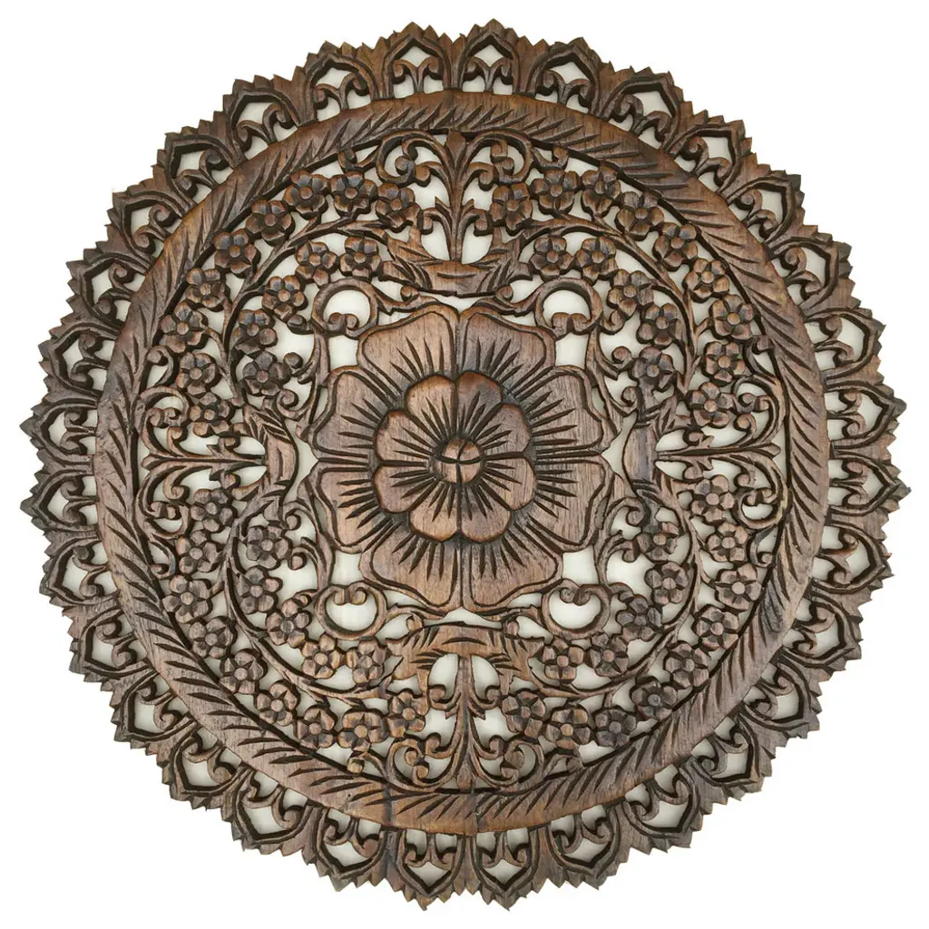 Hand carved teak Burmese panel. Traditional intricate floral designs used for various decorate purposes. Fabulous in groupings used as headboards ceiling plates or as interesting exterior design elements. Each may vary slightly in exact finish, handmade differences, and natural imperfections. This item is non-returnable - all sales are final.