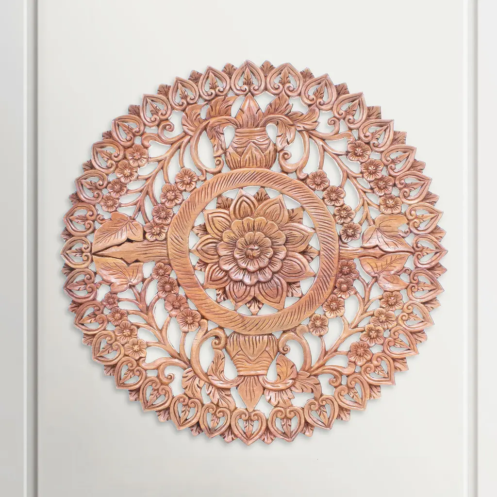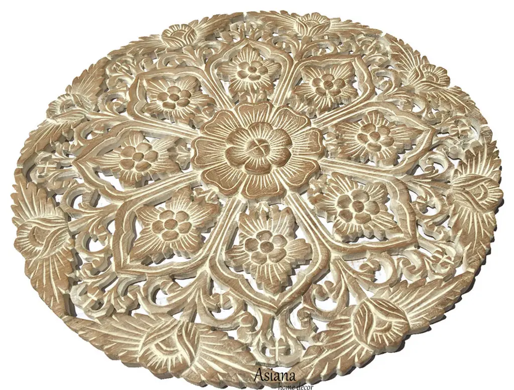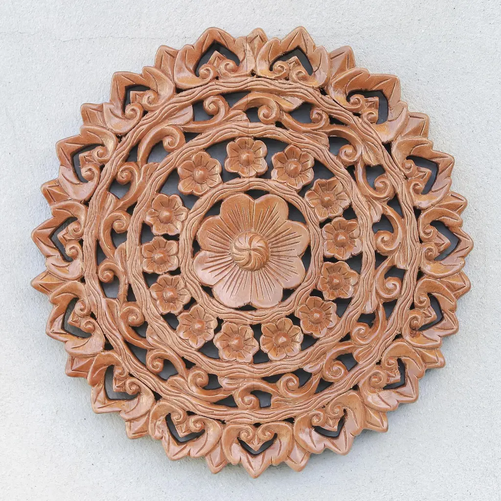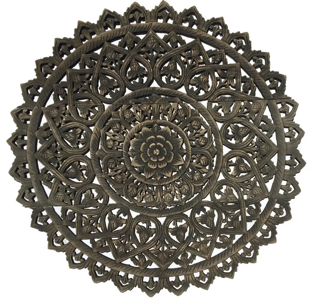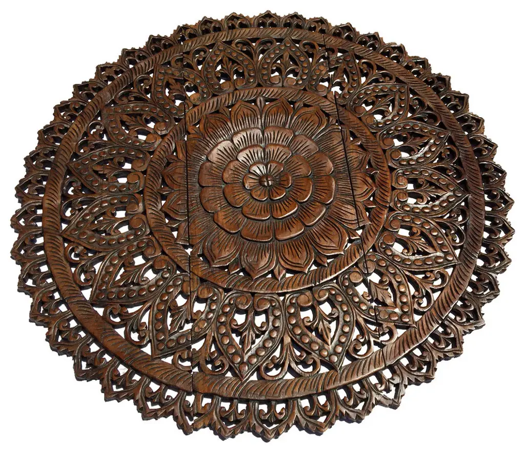 Hand carved teak Burmese panel. Traditional intricate floral designs used for various decorate purposes. Fabulous in groupings used as headboards ceiling plates or as interesting exterior design elements. Each may vary slightly in exact finish, handmade differences, and natural imperfections. This item is non-returnable - all sales are final.