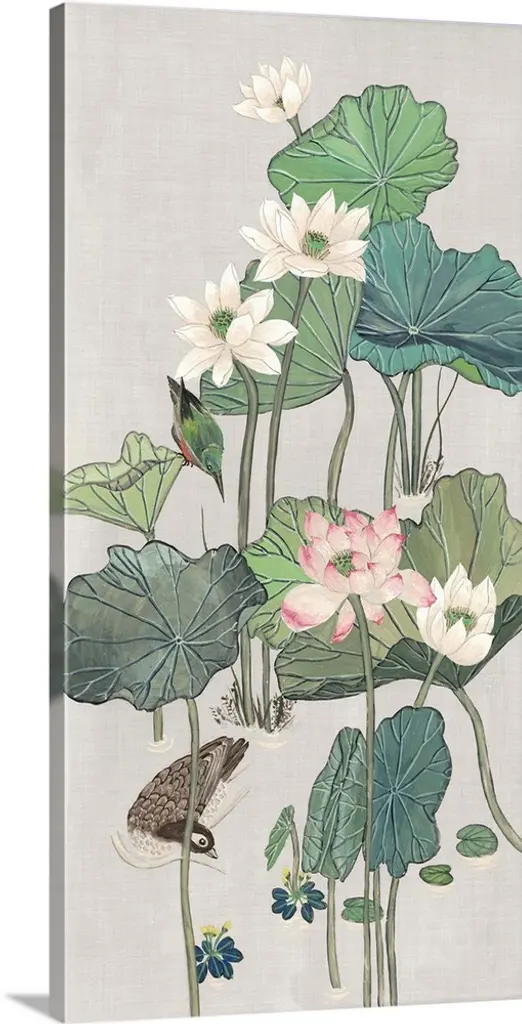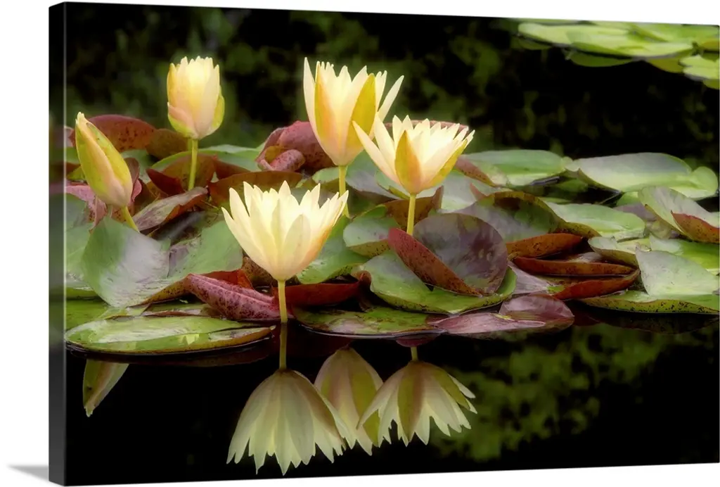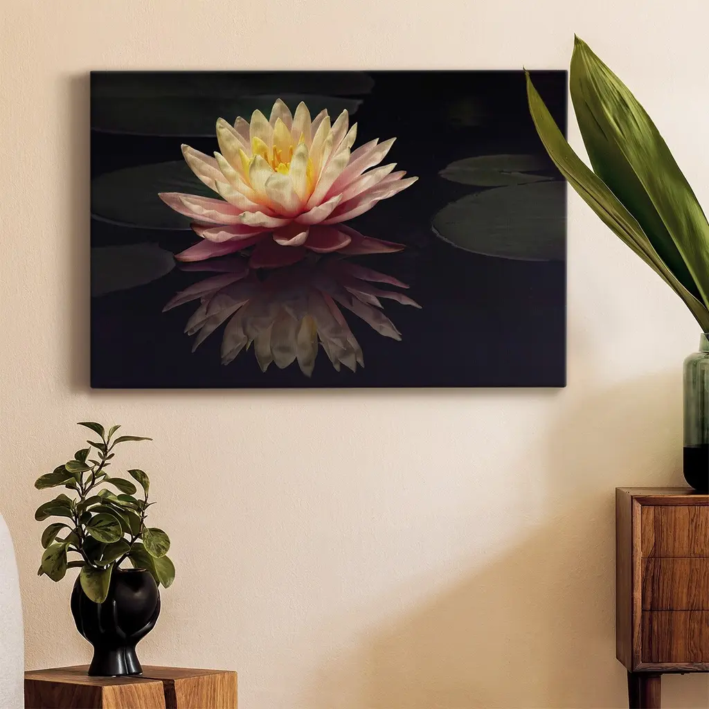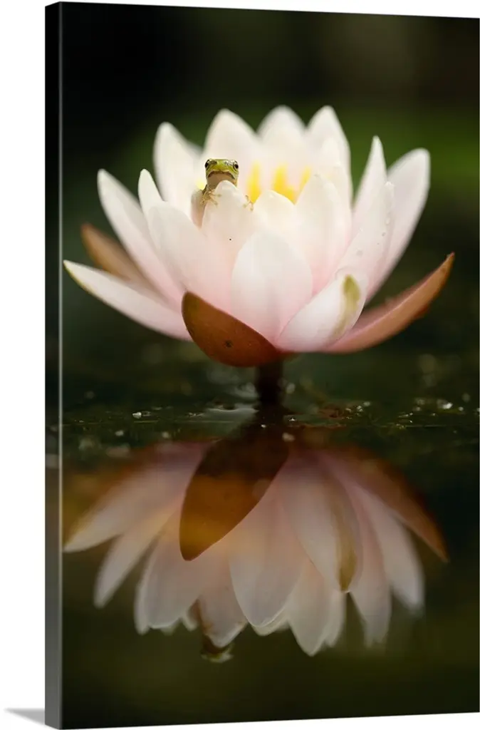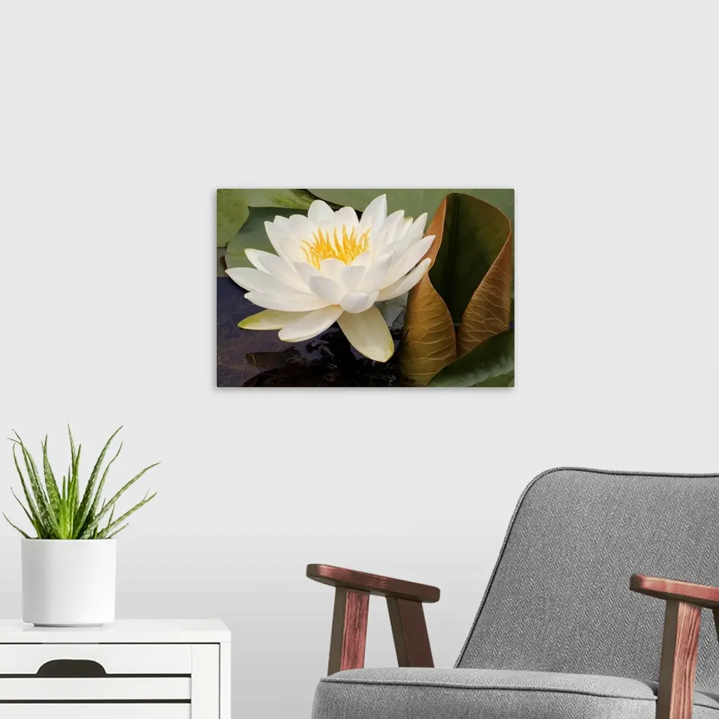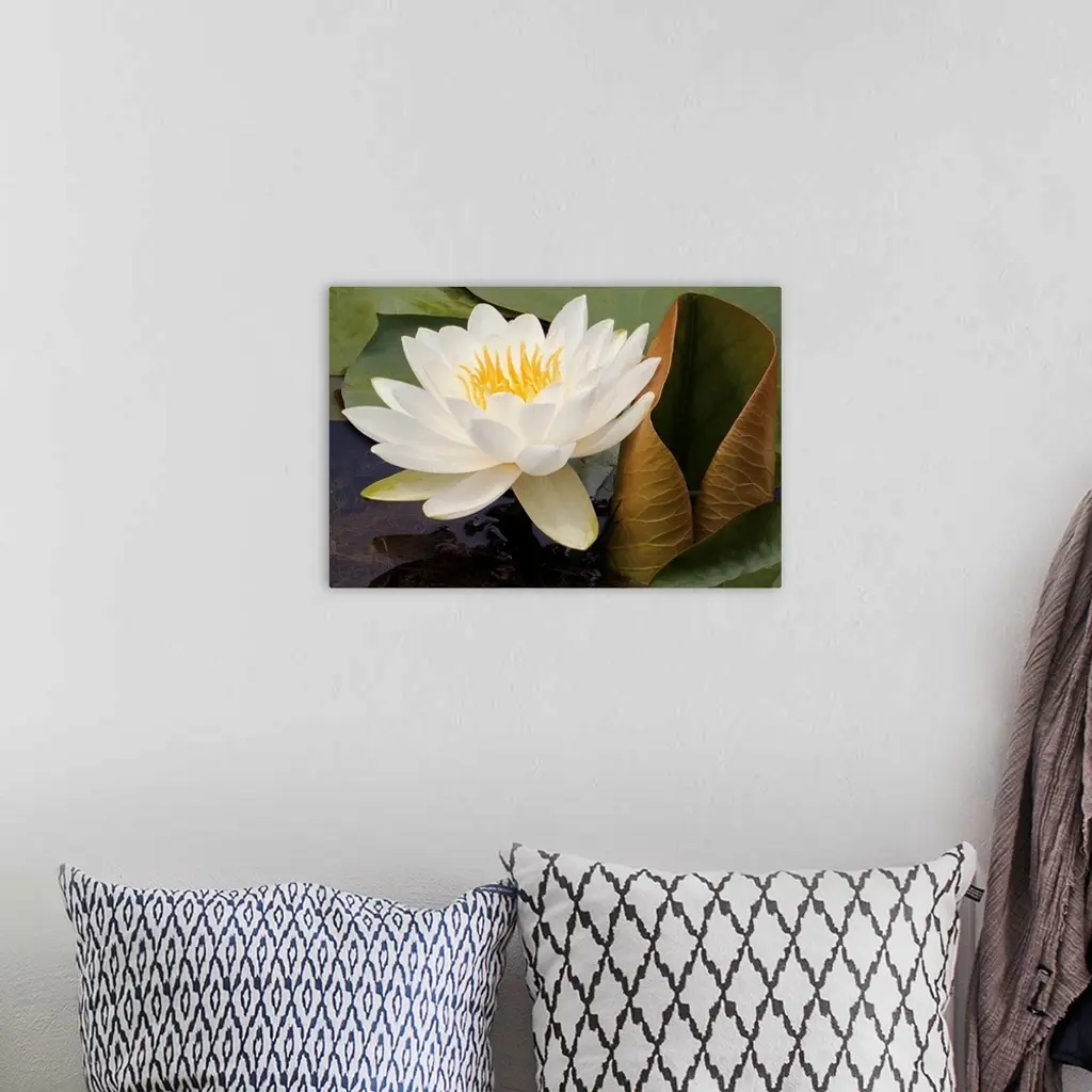Photograph of a single flower on surrounded by lily pads with underwater seaweed visible.