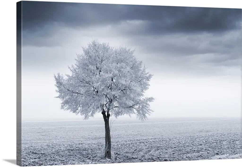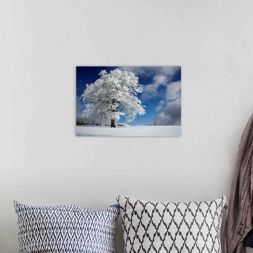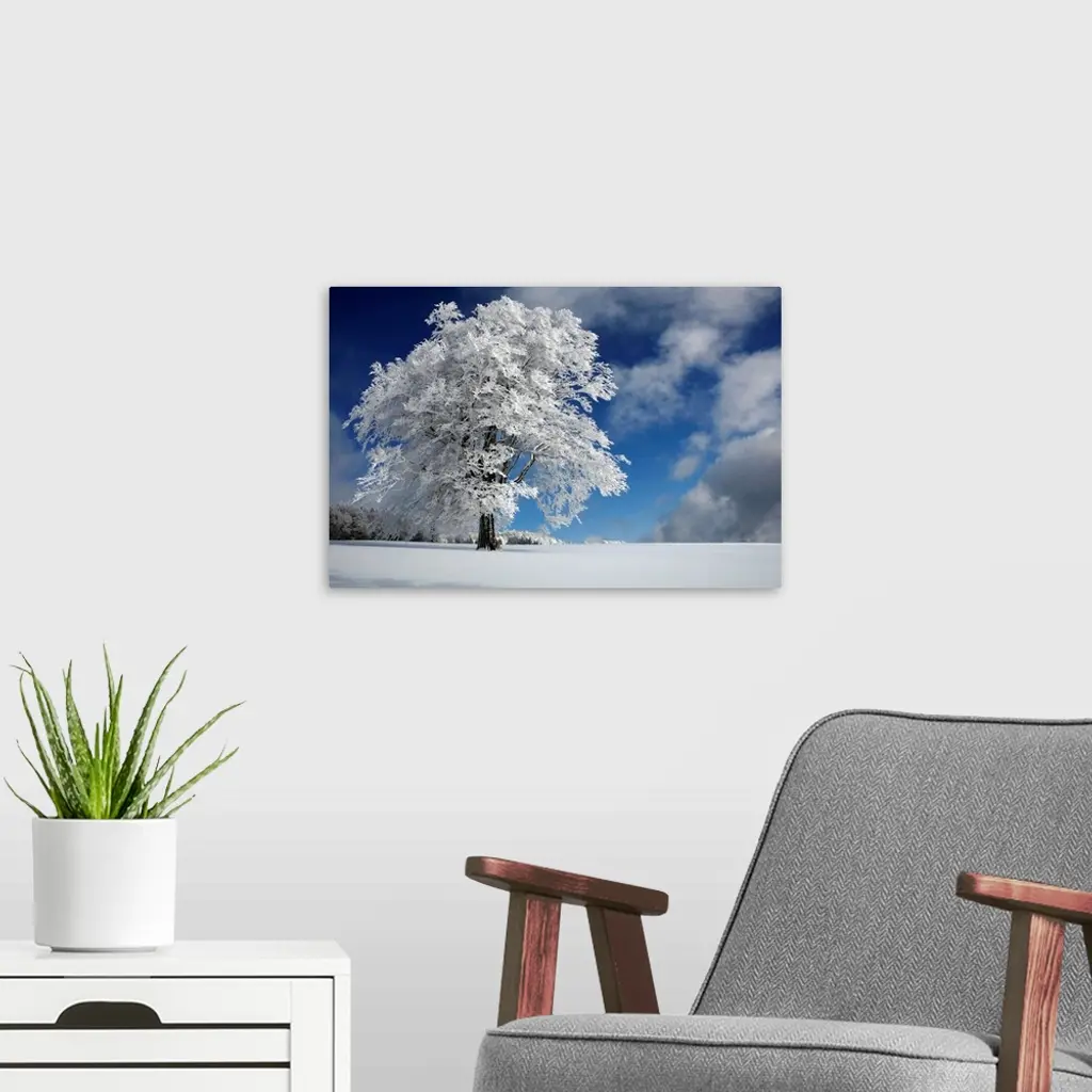 A German winter landscape with a tall tree covered in white foliage.