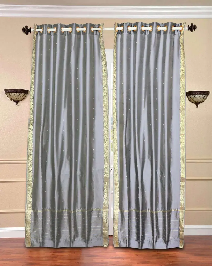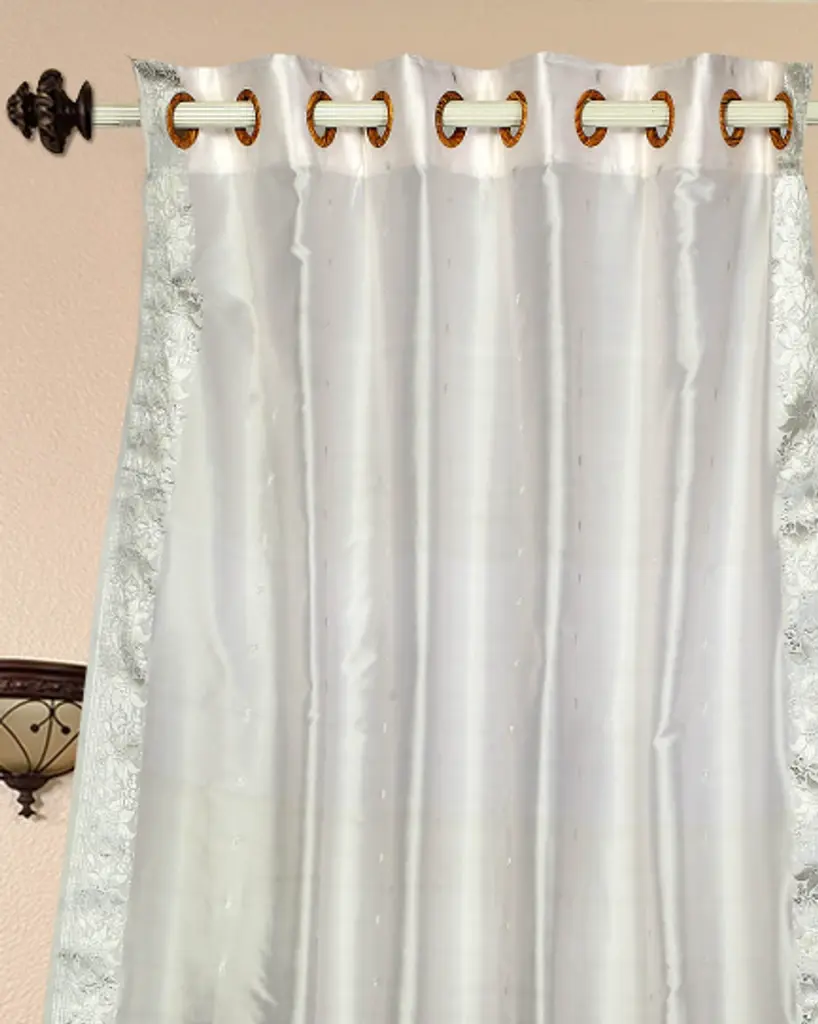 Ring-top drapery is sophisticated and contemporary. Ring-tops have decorative rings attached to the drapes. Rings create a pleated look that is crisp and modern. Sari Curtains / Drapes / Panels are the perfect choice for those looking for light, elegant drapes with a touch of luxury. It has smooth finish with a soft sheen and feels gentle and cool to the touch. Sheer curtains made of saris allow light in through windows but prevent people looking in when they are drawn. Story Behind the Art: The fabric of these curtains are weaved on a hand-loom in a small rural village in India and then hand-dyed. The artisans are a group of young hand-crafters who have moved from small villages to a big town in Central India and make various home decor items out of these exotic sari fabrics. This gives these wonderful artisans a way to have sustainable income via selling to the worldwide market on the internet. Your purchase supports local and home-based work where the artisans can easily tend to their families and pass these time-honoWhite with Silver trim skills from one generation to the next.