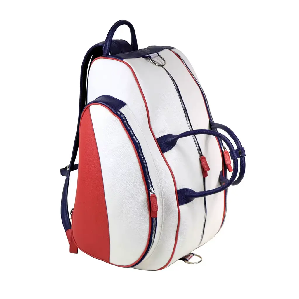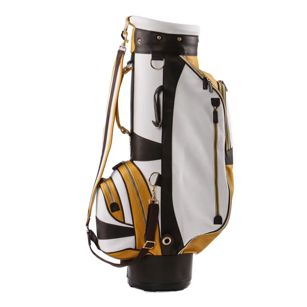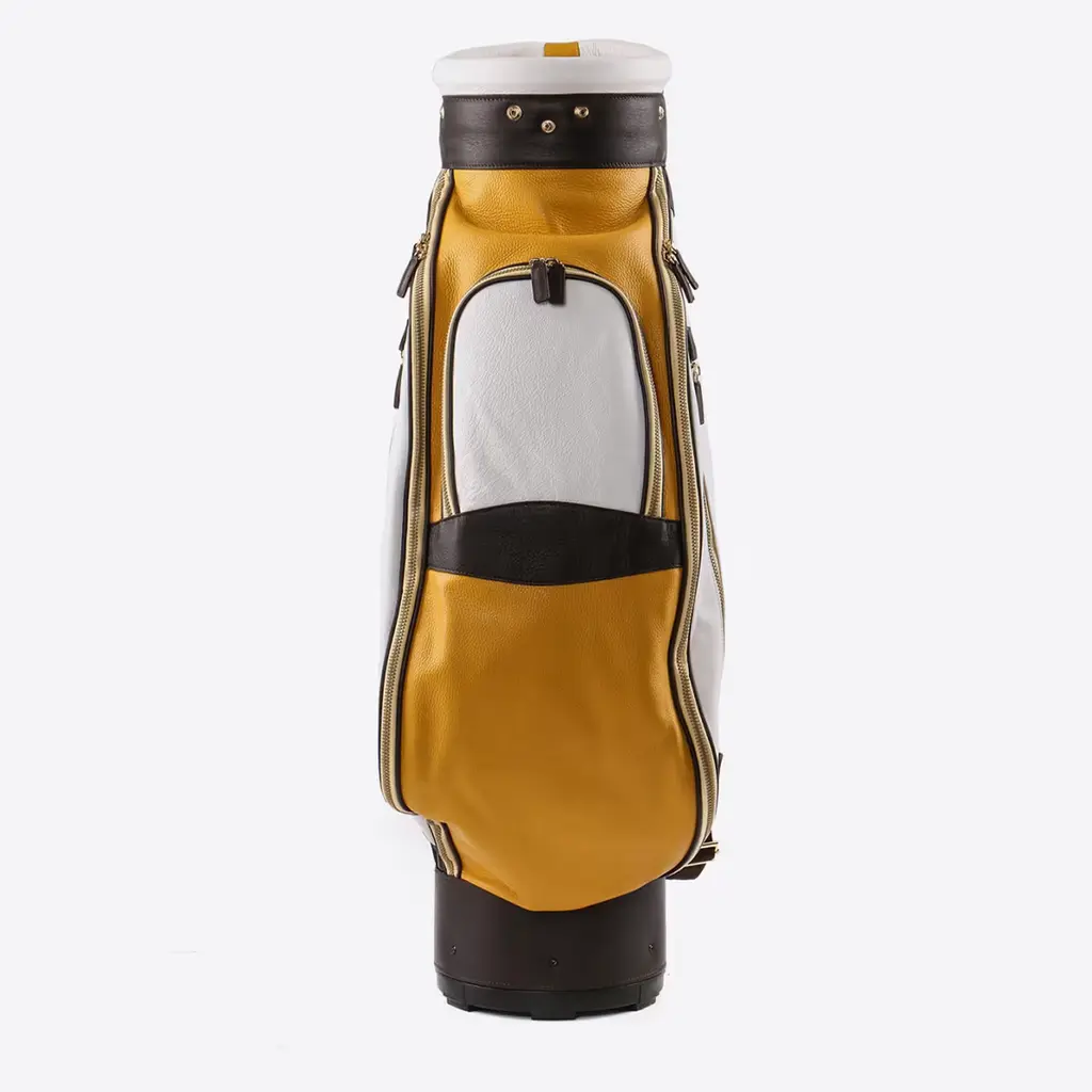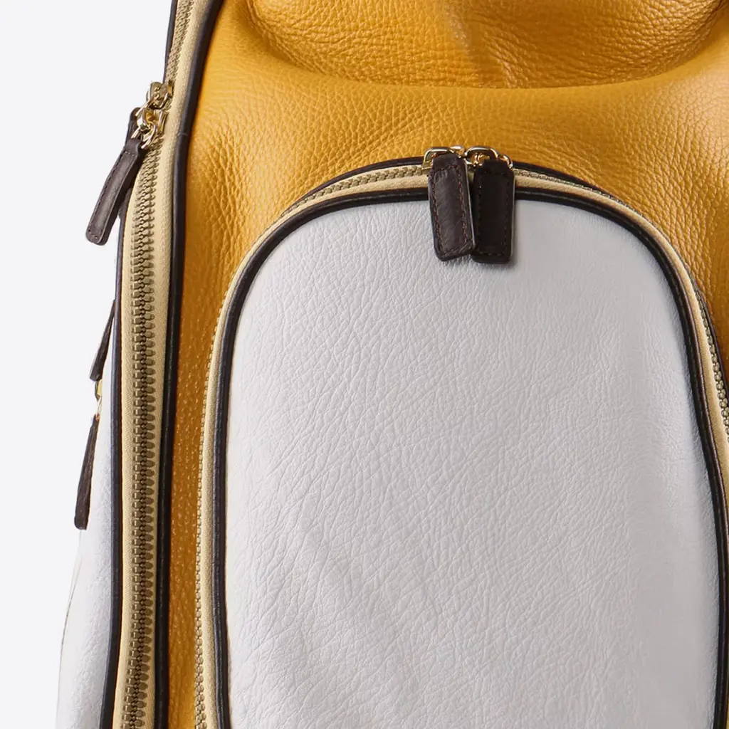 With a weatherproof shell and the addition of an optional shoulder strap for easy carrying, this is the perfect companion for the avid golfer. Featuring a zip closure, lined interior and internal and external pockets, this optimal quality leather golf bag, is stylish and functional in the color combination of white, yellow and brown.