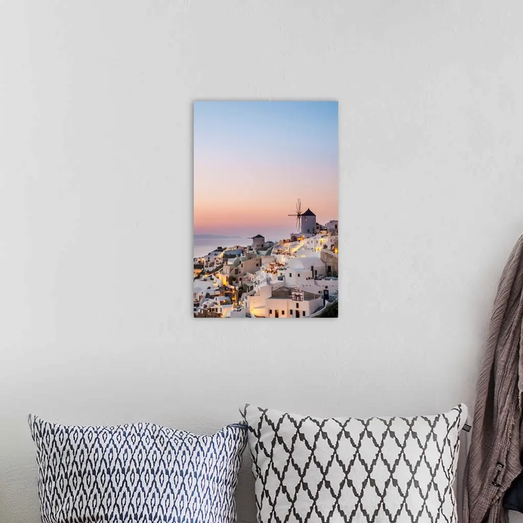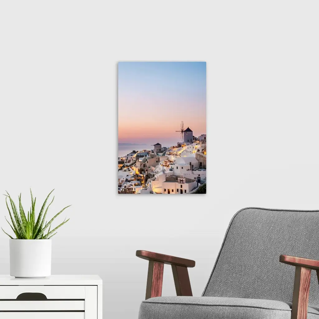 Whitewash buildings and windmill at dusk; Oia, Santorini, Greece wall art for home and office decor. Discover canvas art prints, photos, mural, big canvas art and framed wall art in GreatBigCanvas.com's varied collections.