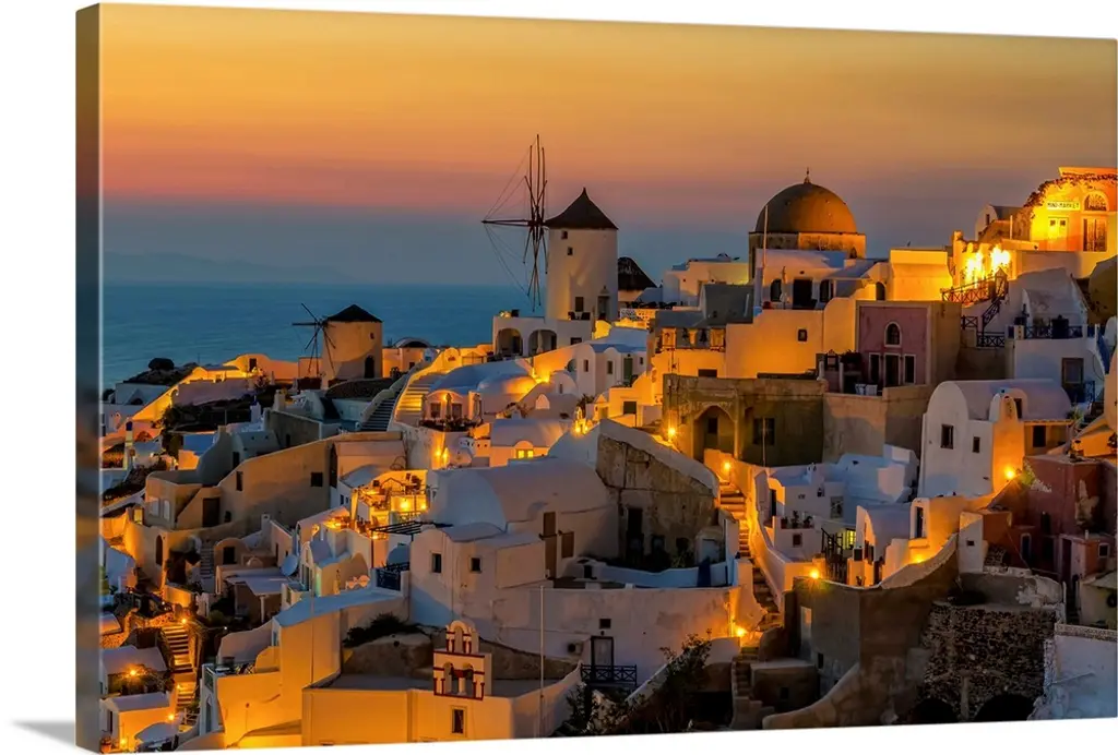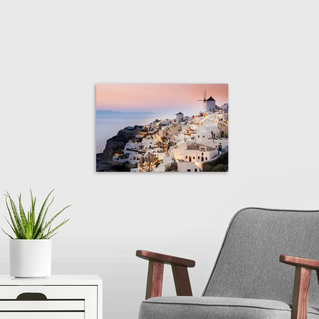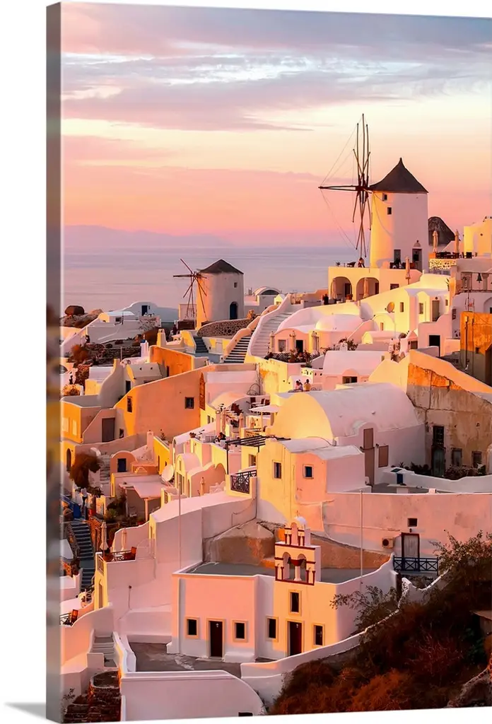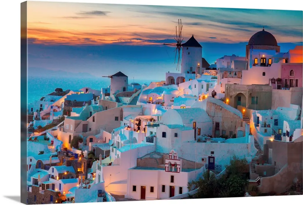 Whitewash buildings and windmill at dusk; Oia, Santorini, Greece wall art for home and office decor. Discover canvas art prints, photos, mural, big canvas art and framed wall art in GreatBigCanvas.com's varied collections.