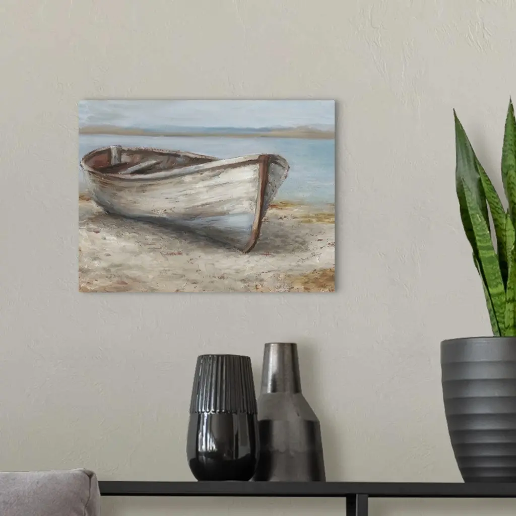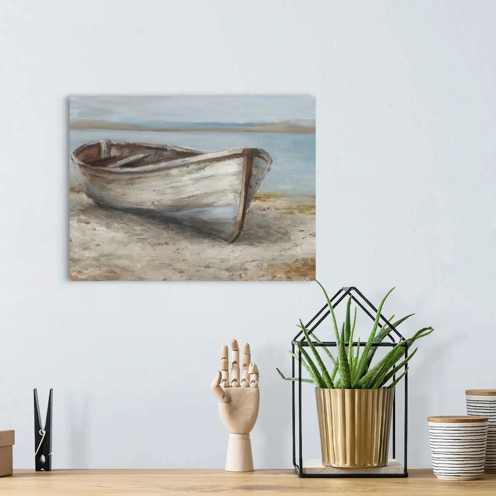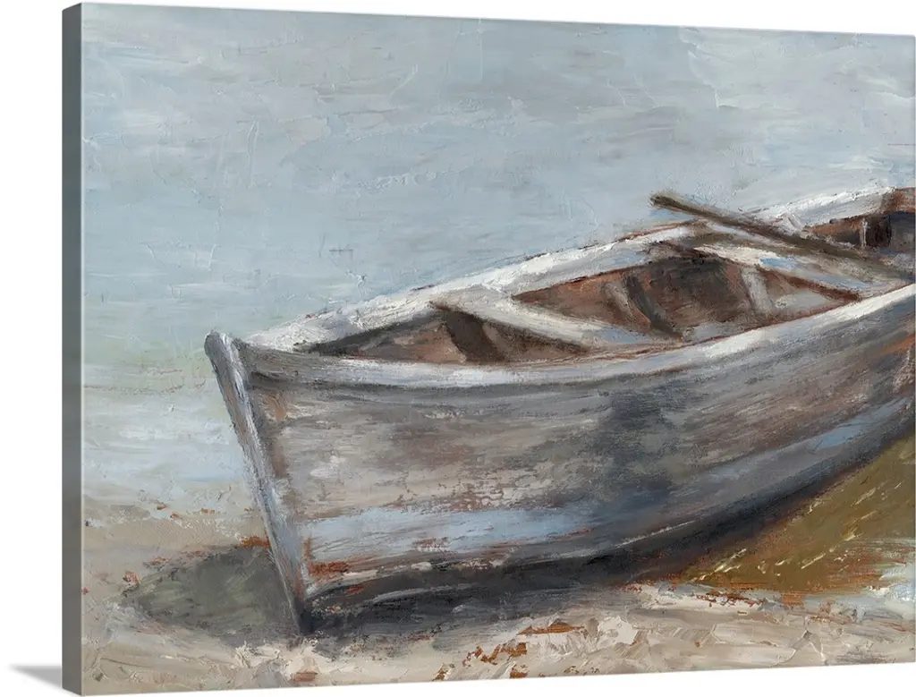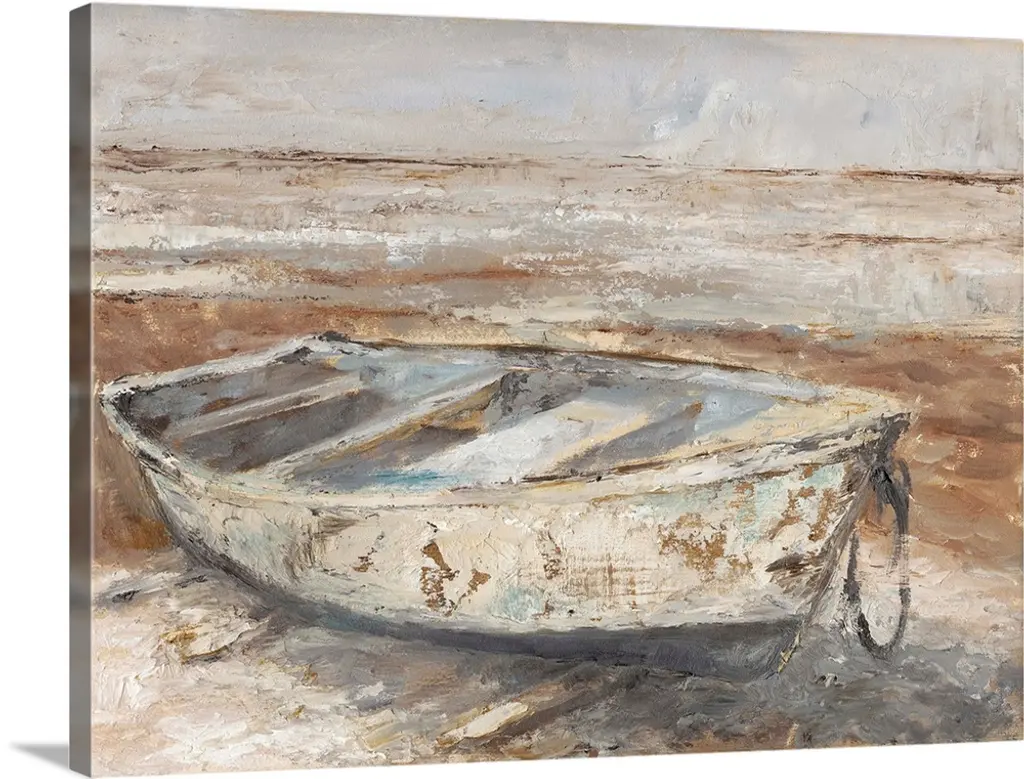 A tranquil, coastal scene of an old wooden rowboat pulled up onto the sand. It features neutral tones and a peaceful composition, and would be the perfect accent piece in a transitional home, lake house or beach house.
