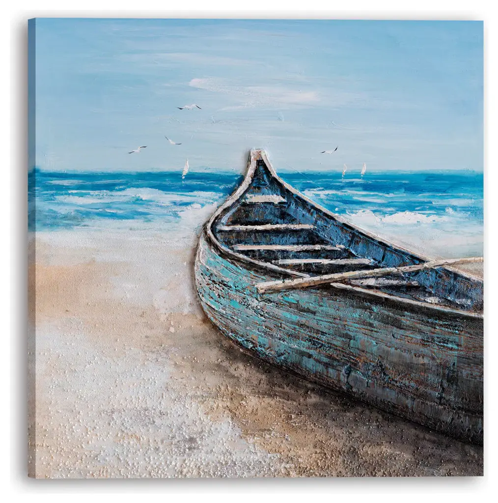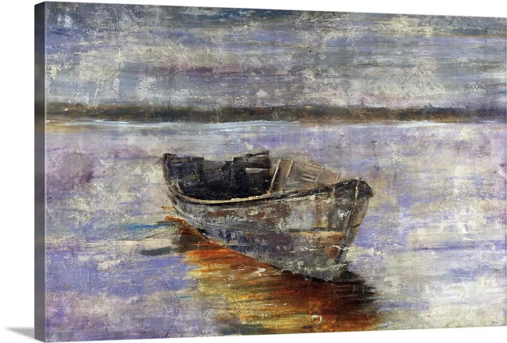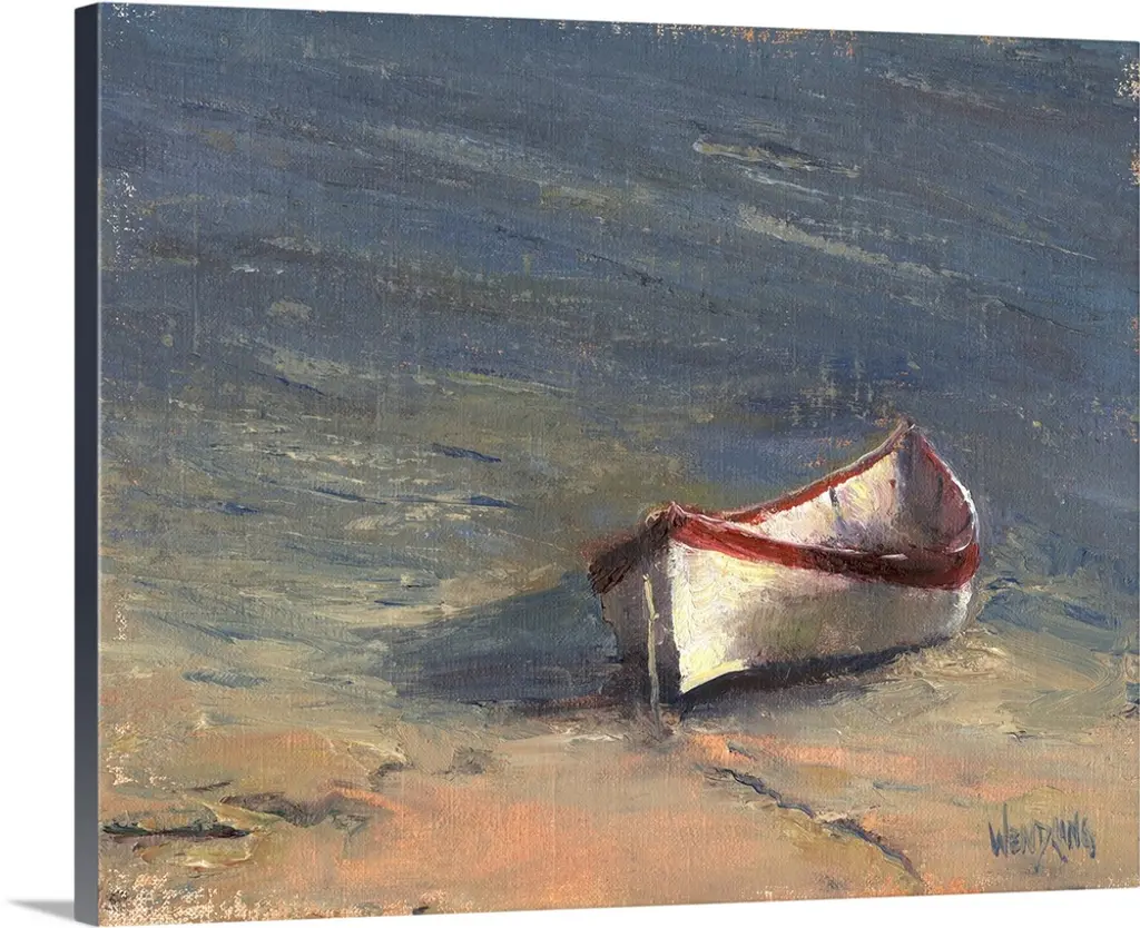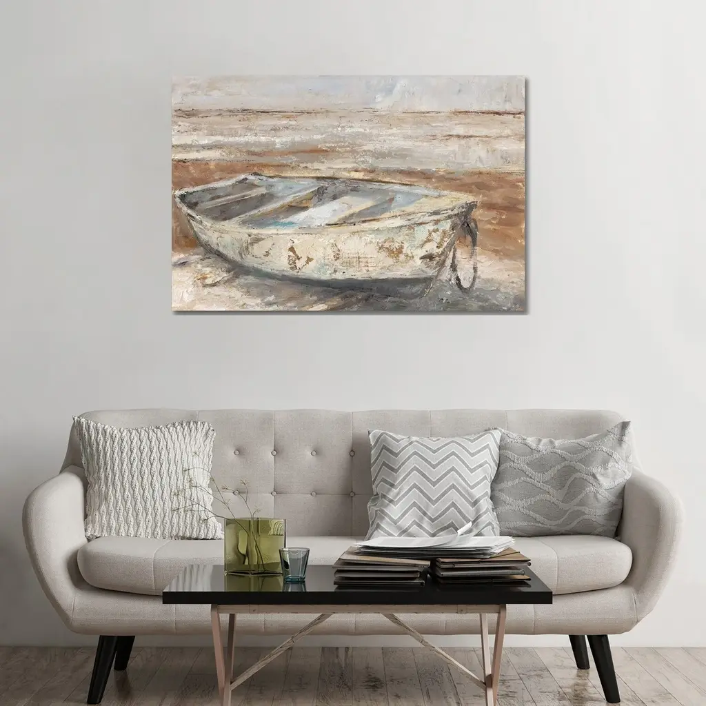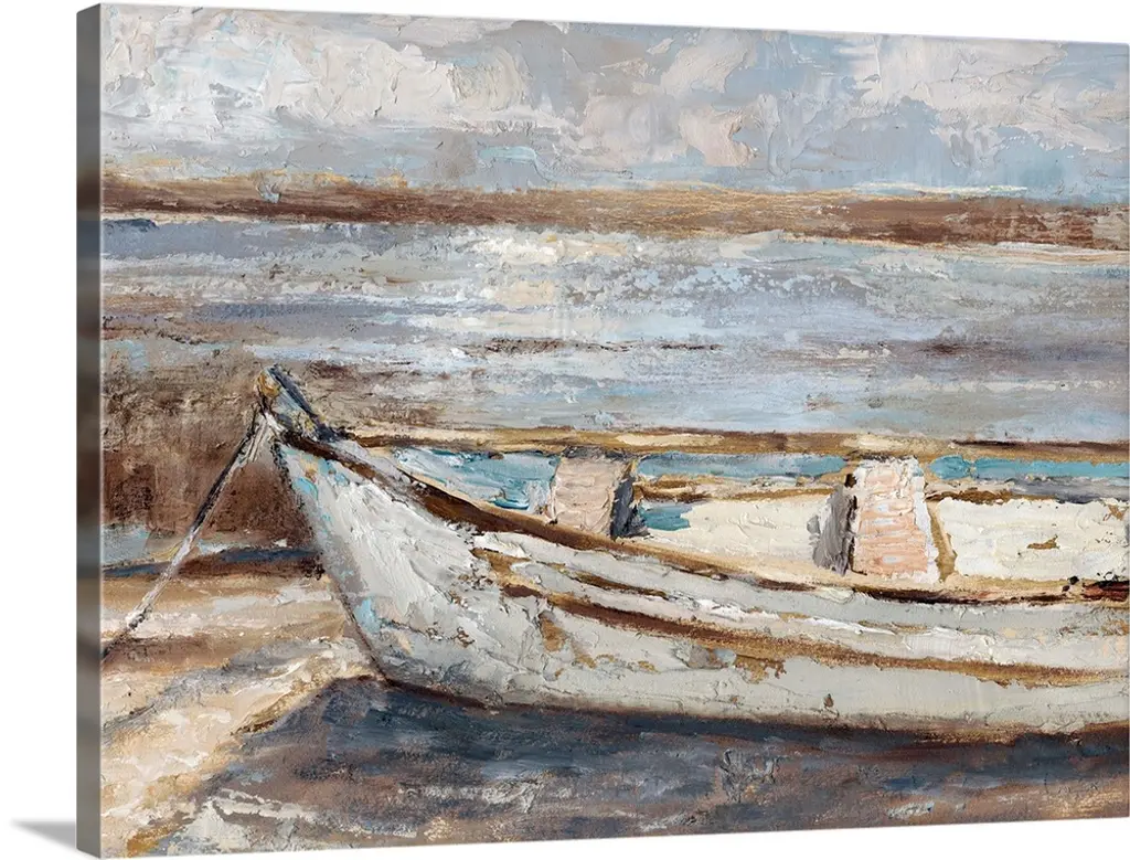 A tranquil, coastal scene of an old wooden rowboat pulled up onto the sand. It features neutral tones and a peaceful composition, and would be the perfect accent piece in a transitional home, lake house or beach house.