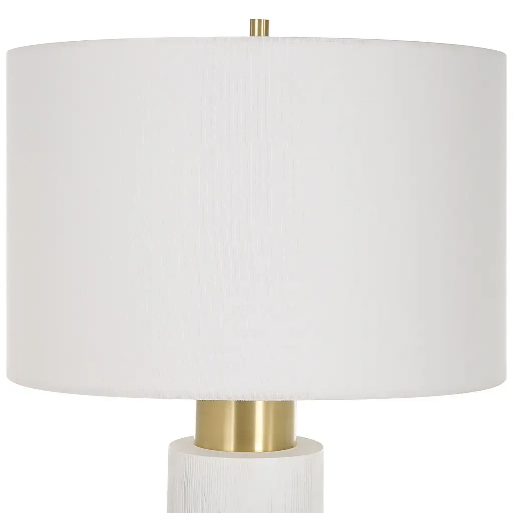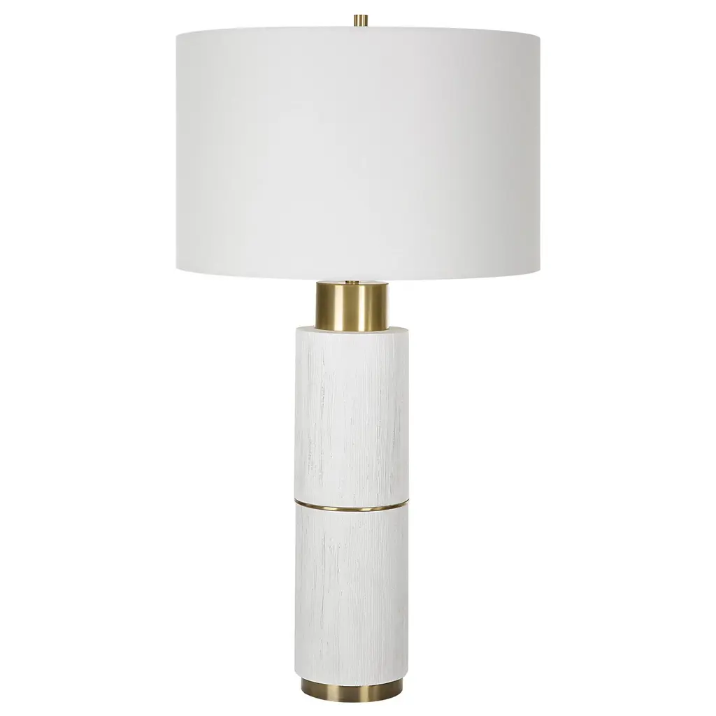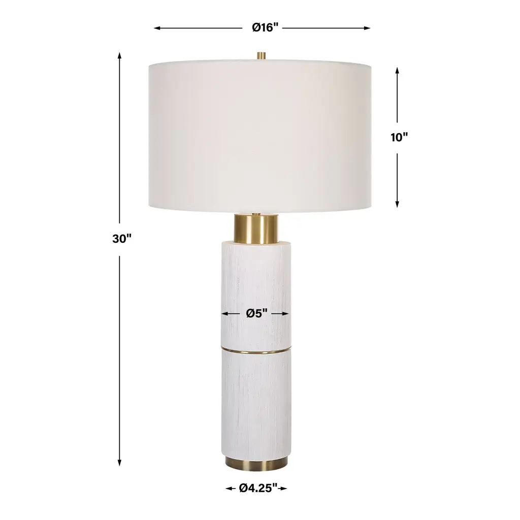 Introduce rustic charm to your space with the table lamp, showcasing a whitewashed wood look and textured finish. Brushed brass plated iron details accentuate its elegance. Topped with a hardback drum shade in fabric, this lamp adds a touch of sophistication, seamlessly merging natural appeal with contemporary refinement in your living space. Product Features: Whitewashed wood look table lamp Table lamp features a textured finish design Accented with brushed brass plated iron details Includes a round hardback shade Lamp uses (1) 150-watt E26 bulb - not included Socket type: 3-way Switch type: socket switch UL listed for indoor use only Dimensions: Overall height: 30" high Base diameter: 5" diameter Shade dimensions: 10" high x 16" diameter Material(s): resin/iron/fabric
