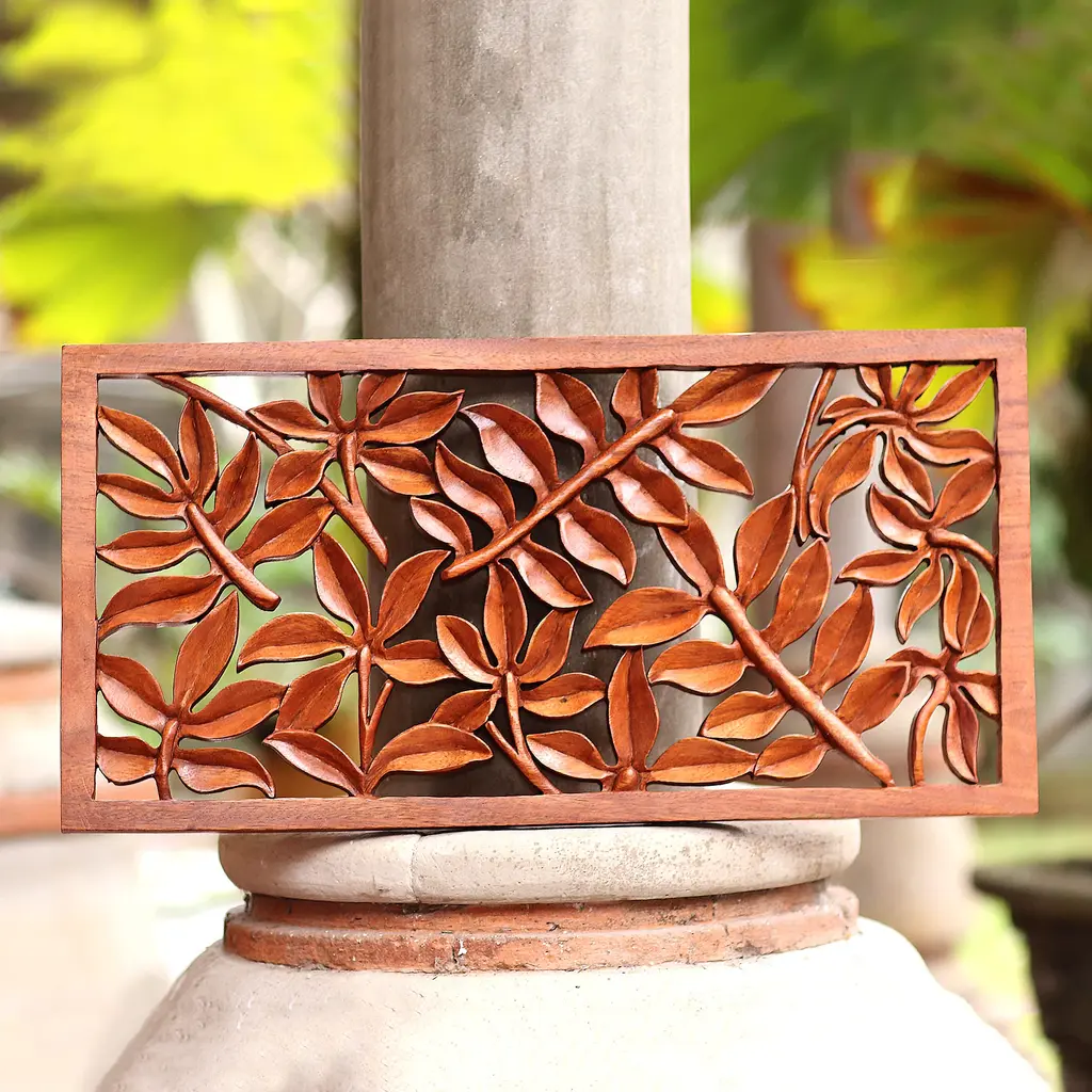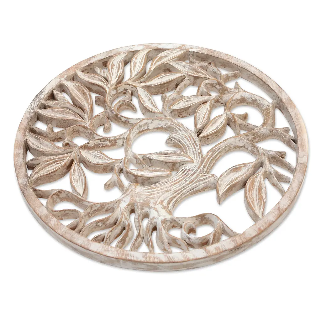 Evoking snow, a whitewashed finish decorates this suar wood relief panel from Bali. Made Mulyani creates this round relief, which is carefully carved by hand.