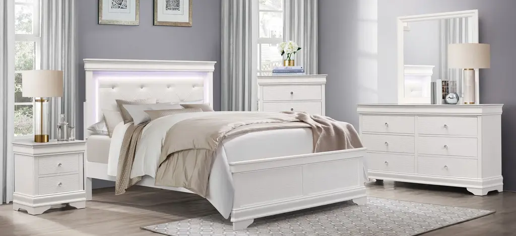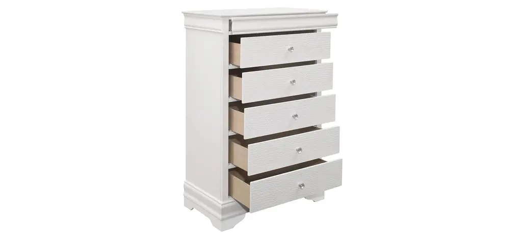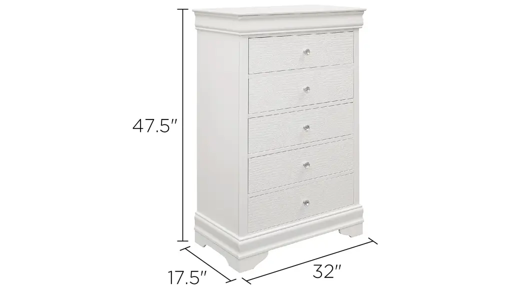 The unexpected intersection of traditional design and glamorous styling creates the dynamic look of the Whiting chest. A white finish is utilized to enhance the faux alligator embossed drawer fronts of the chest with crystal faceted knob hardware lending an additional fabulous touch. The chest features hidden storage allowing for the discrete placement of your personal affects.