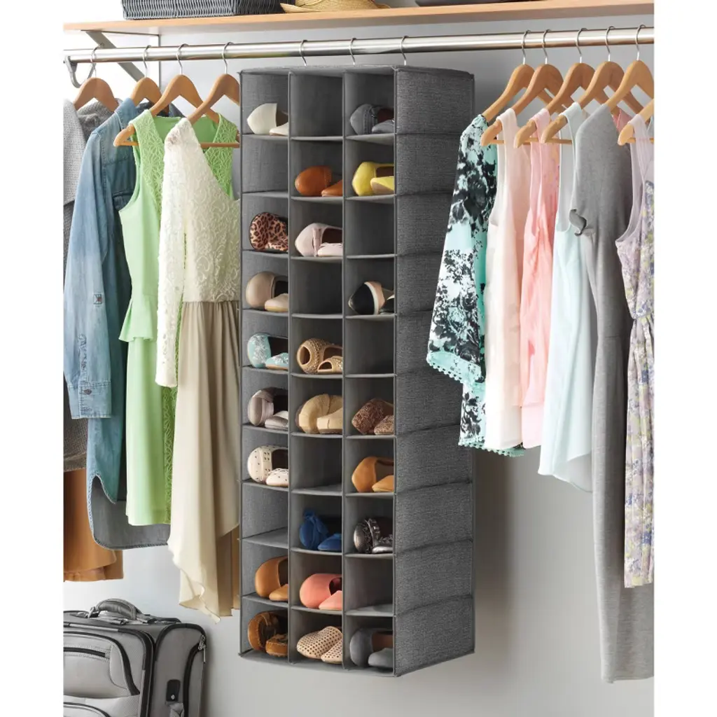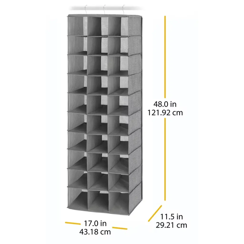 Whitmor's Hanging Shoe Shelves is the perfect shoe storage solution without taking up additional floor space. With room to store up to 30 pairs of shoes, this shoe shelf is perfect for organizing bedrooms, laundry rooms, and college dorm rooms. Created with strong, yet breathable fabric containing reinforced seams for additional strength and support. These hanging shoe shelves have a quick set up; the metal hooks hang from the closet rod or garment rack. With a sturdy steel frame, this hanging shoe shelf will be able to organize and showcase your shoe collection! Easy to clean, just wipe with a damp cloth and towel dry. Assembled Dimensions: 11.50 L x 17.0 W x 48.0 H inches.