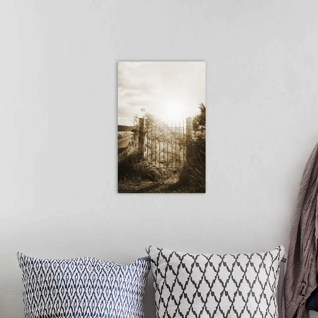 A photograph of a gate fence gate silhouetted by a rising sun.