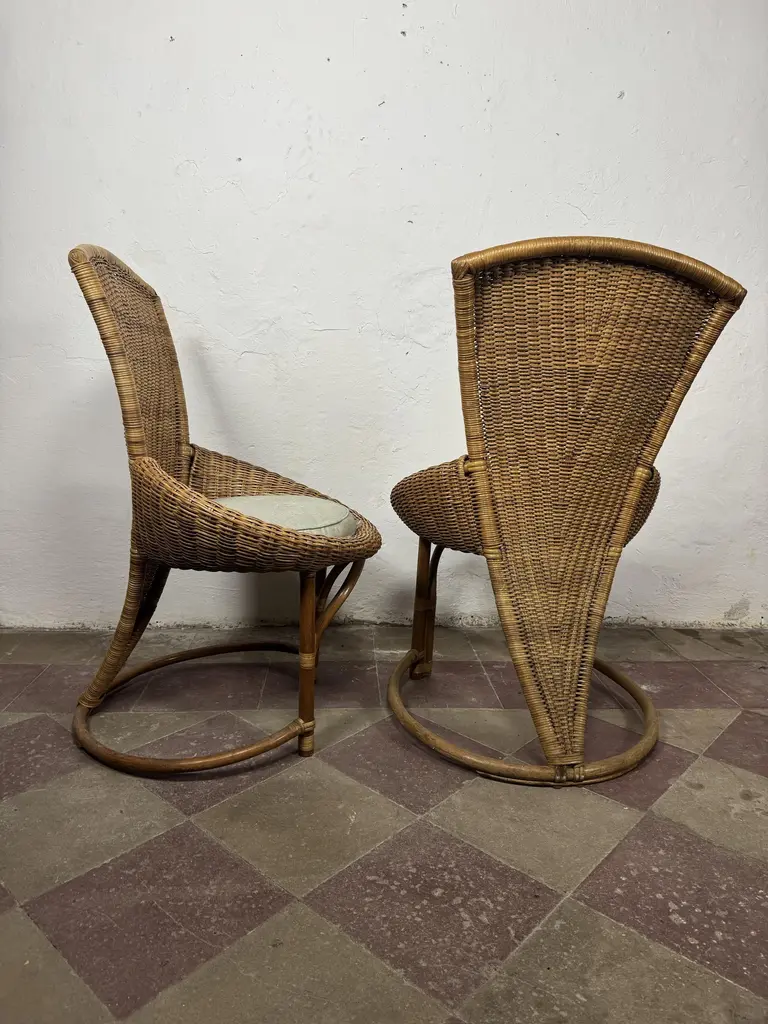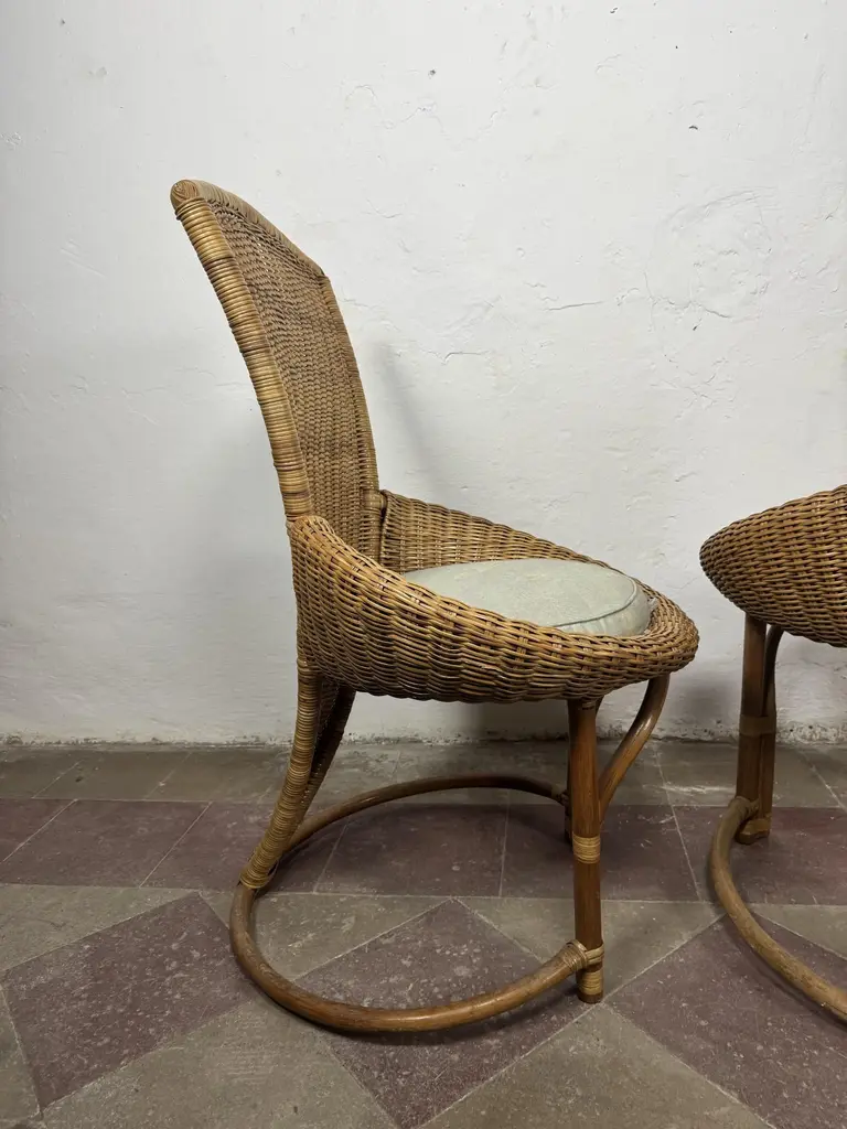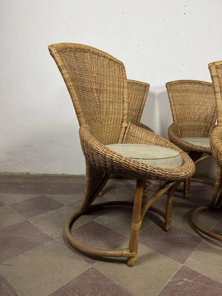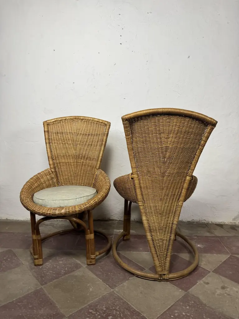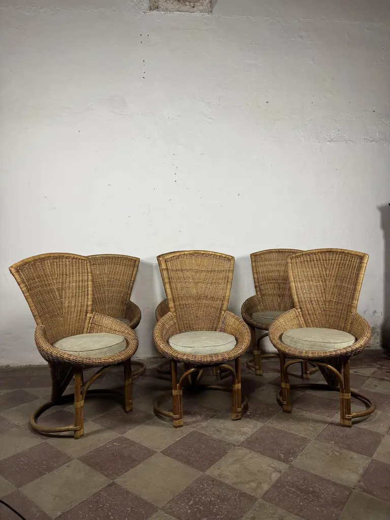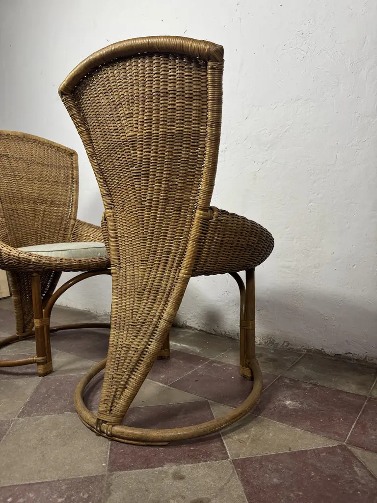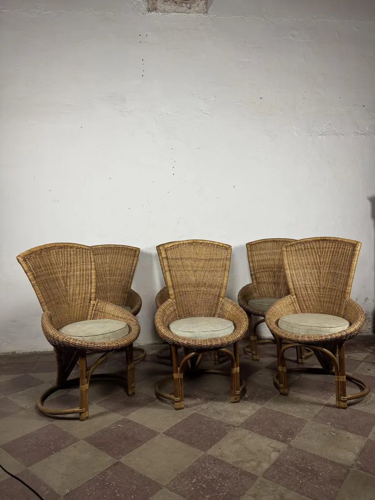 Set of 6 wicker chairs – 1960s Elegant set consisting of six wicker chairs from the 1960s, characterized by an extraordinary craftsmanship of the curved back, which gives impetus and personality to the structure. The enveloping and harmonious design, combined with the curved wooden ring base, gives the seats a fluid and sculptural line, perfect for interior environments with a natural or boho flavour. The quality of the weaving and the ergonomic shape make these chairs not only a fascinating piece of furniture, but also comfortable and resistant over time. Ideal for those looking for an authentic vintage touch with timeless elegance.