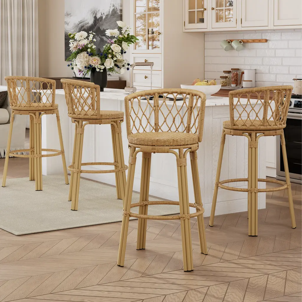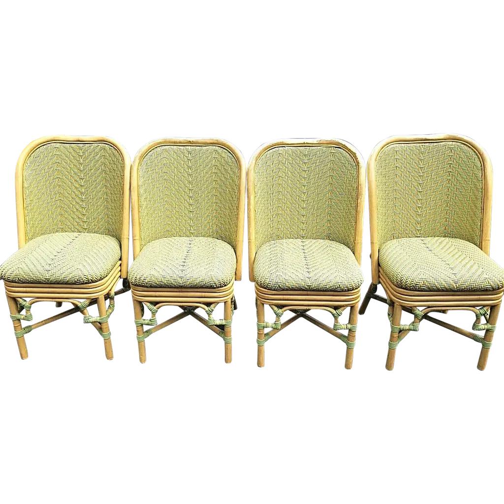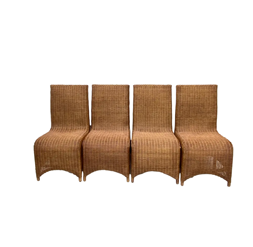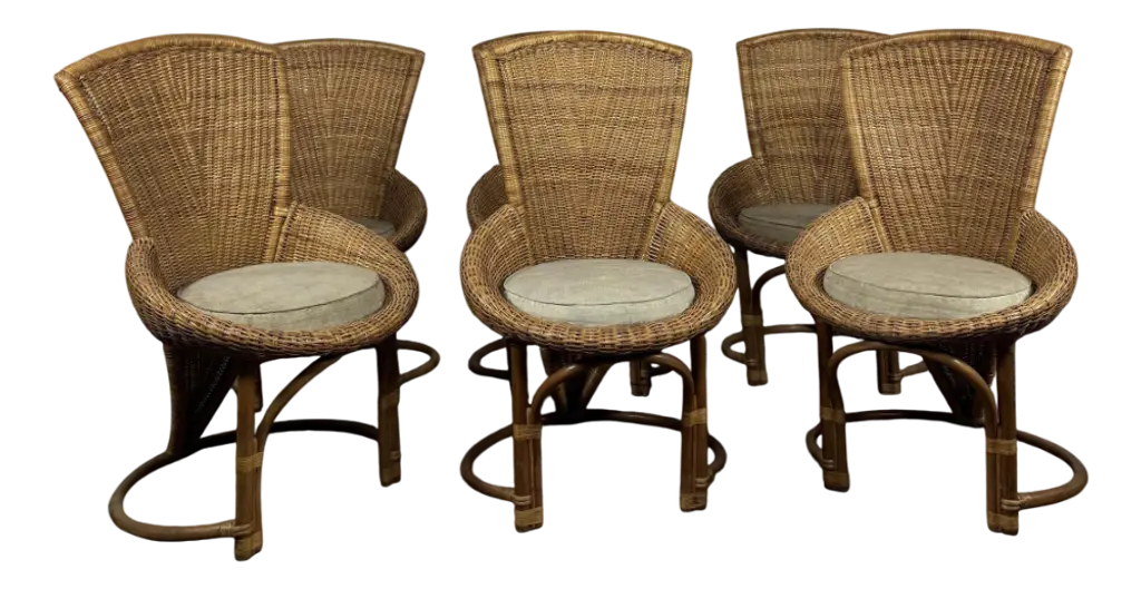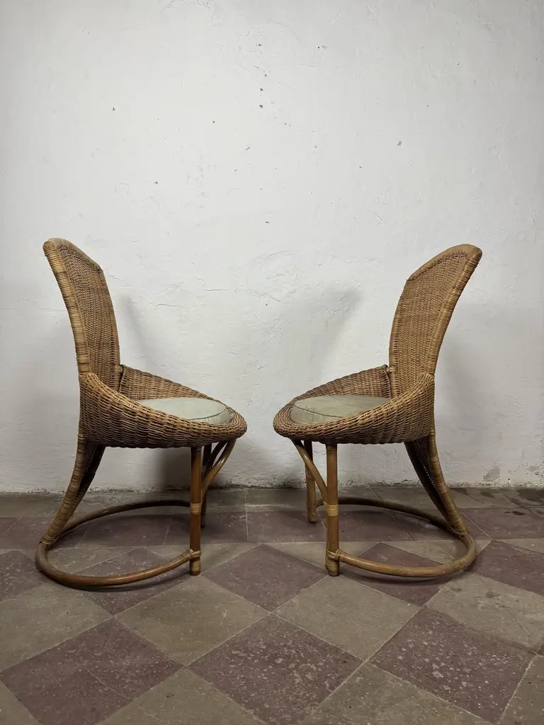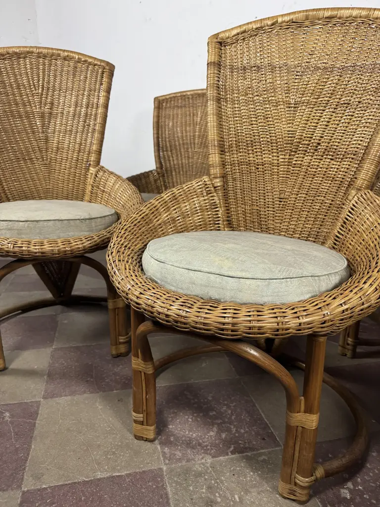 Set of 6 wicker chairs – 1960s Elegant set consisting of six wicker chairs from the 1960s, characterized by an extraordinary craftsmanship of the curved back, which gives impetus and personality to the structure. The enveloping and harmonious design, combined with the curved wooden ring base, gives the seats a fluid and sculptural line, perfect for interior environments with a natural or boho flavour. The quality of the weaving and the ergonomic shape make these chairs not only a fascinating piece of furniture, but also comfortable and resistant over time. Ideal for those looking for an authentic vintage touch with timeless elegance.