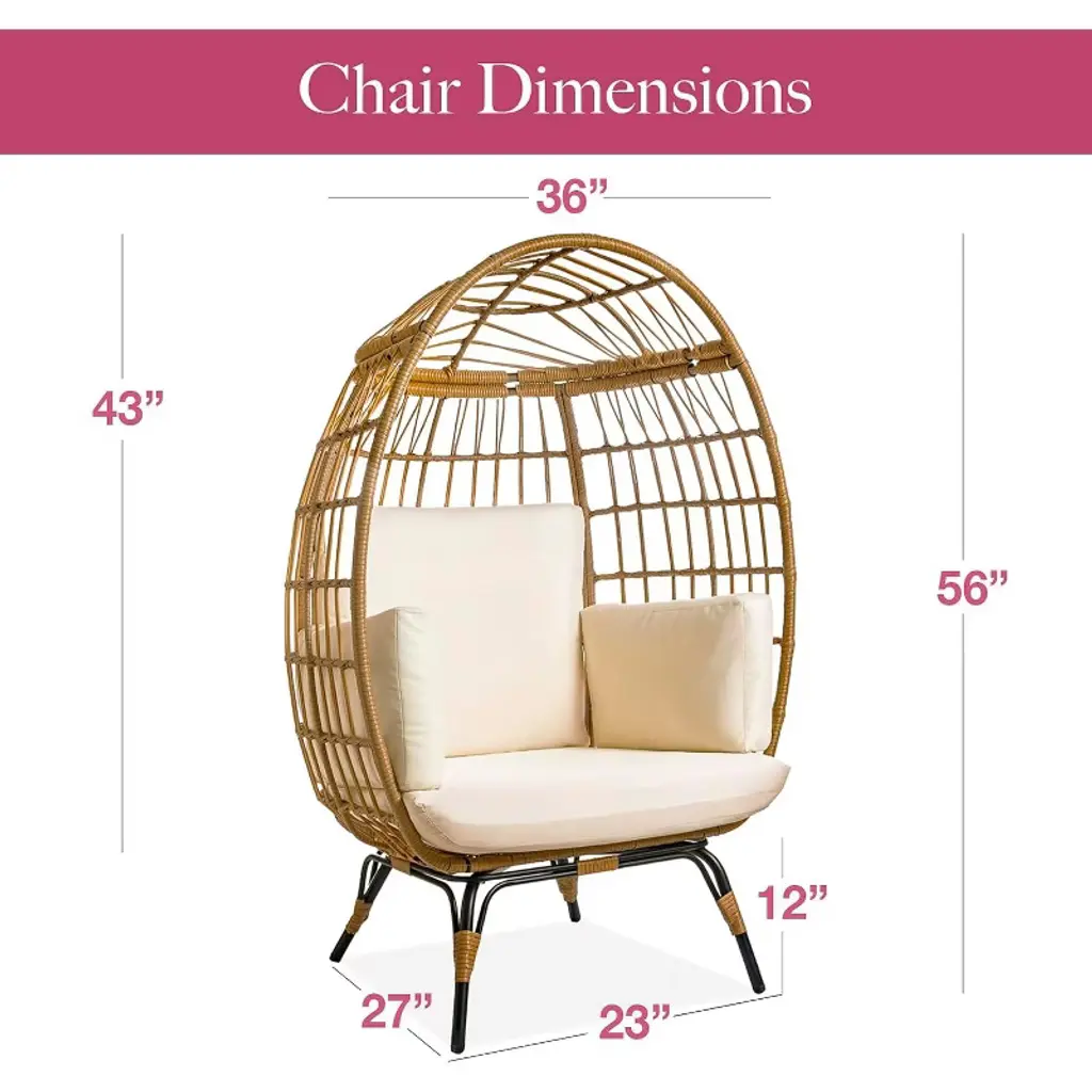 Enhance your space with this handcrafted rattan egg chair, featuring an open-weave bohemian design that complements your living room, bedroom, or sunroom. Its soft upholstered top, waist pillow, and headrest ensure maximum comfort, perfect for relaxing, reading, or unwinding. Built with a heavy-duty steel frame and powder-coated finish, this chair supports up to 450 lbs while resisting water, UV rays, and rust. The all-weather PE rattan and weather-resistant cushions make it ideal for patios, gardens, and poolside lounging. Stylish, sturdy, and designed for year-round use, this wicker egg chair is the perfect blend of comfort and durability!