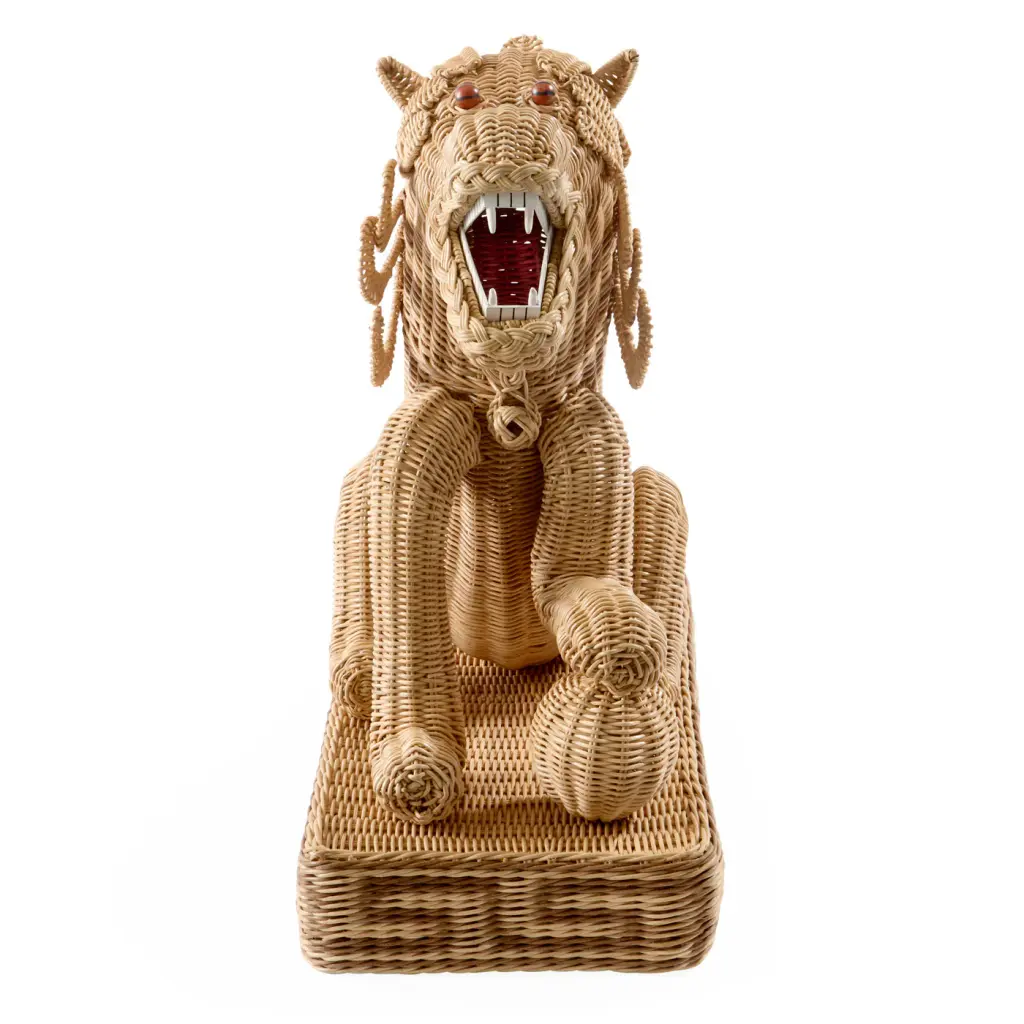 Wild Style. Our take on the traditional Foo Dog statue. Reeds are soaked and then woven, then trimmed and sanded by hand and coated with a clear lacquer to enhance the natural rattan coloring. Fabulous in pairs flanking everything from doorways to consoles. Each Wicker Foo Dog is crafted by a single artisan, taking two weeks to complete.
