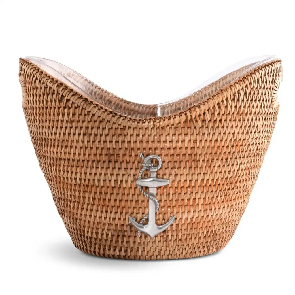 Experience the fusion of craftsmanship, design, and functionality with our Designer Rattan Ice Tub, a perfect gift for those who find beauty in sustainability. Featuring an artfully hand-woven rattan base, the tub draws attention with its gleaming pewter anchor, symbolizing stability and strong foundations. Its generous size of 11 inches high x 13 inches across makes it perfect to host an array of chilled beverages including beer, champagne, and sodas for any event. A removable acrylic insert keeps all drinks within easy reach and simplifies cleaning. Vagabond House is a family-owned American company specializing in fine pewter tableware, servingware and giftware. Largely inspired by nature, their exclusive products are designed to be unique, functional heirlooms for those who seek to express tradition and style in both family and formal entertaining.