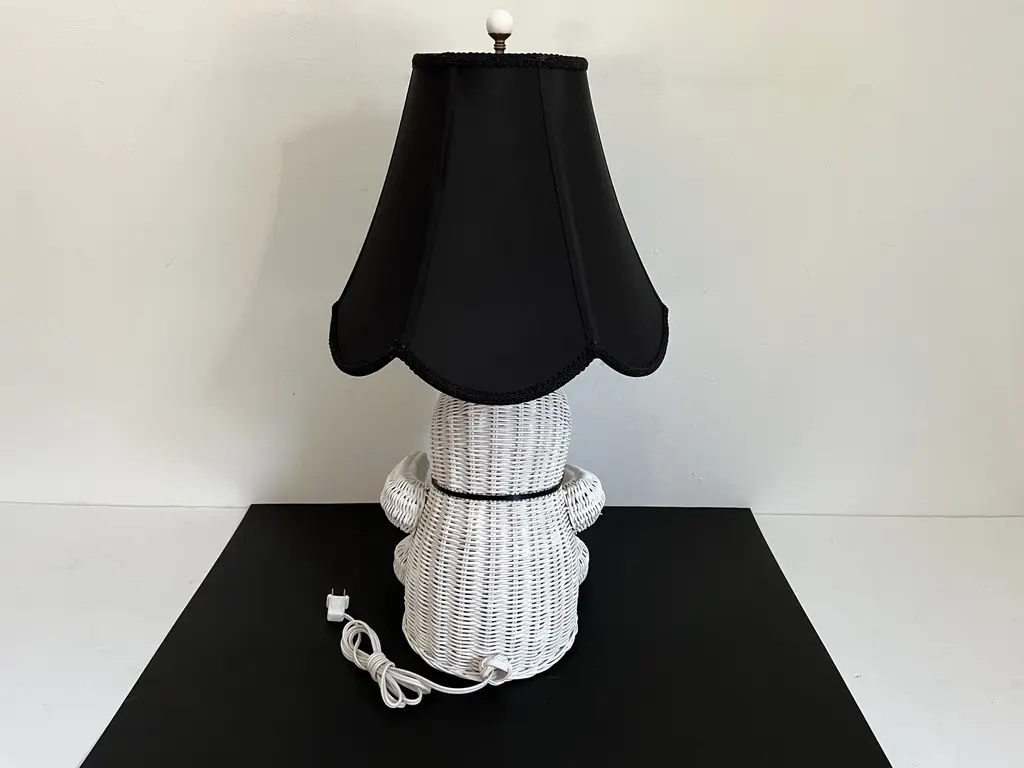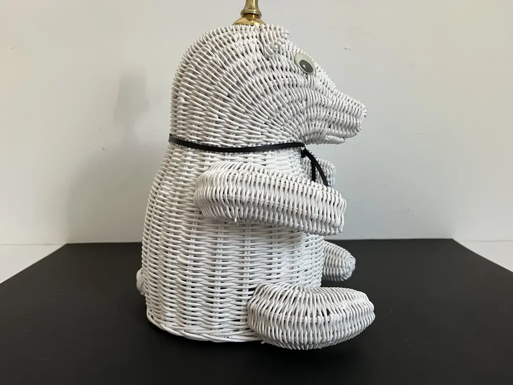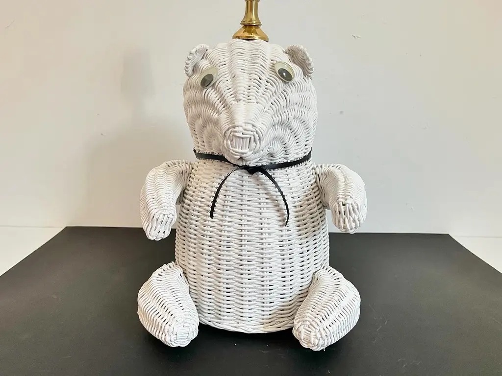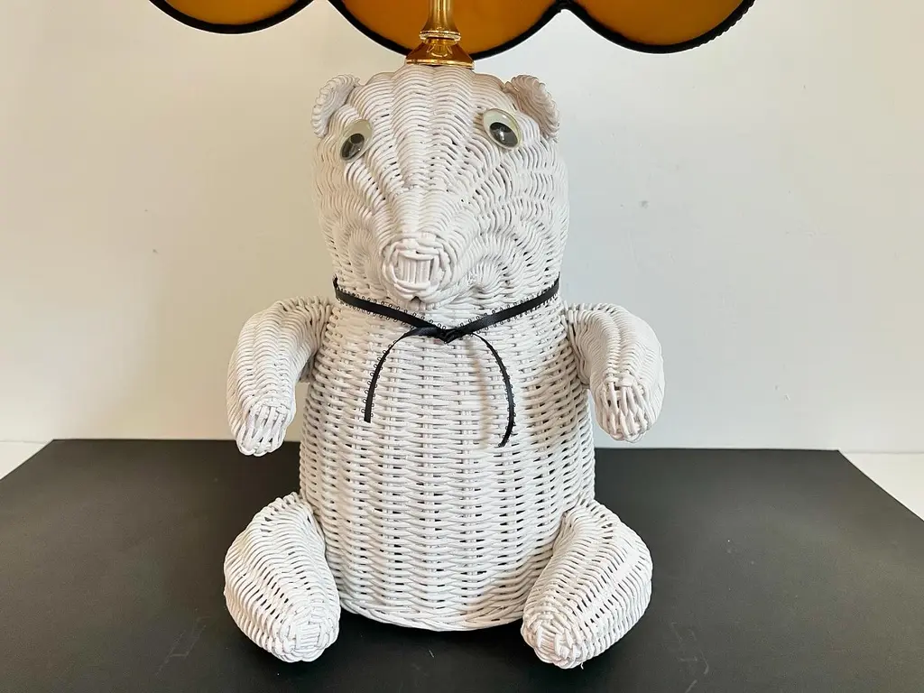 Large mid century wicker teddy bear lamp in its original white painted finish featuring a whimsical upright seated bear complete with googly eyes, ribbon necktie, and round tail. Professionally restored with all new wiring, brass fittings, new cord and plug and socket for standard bulb. New scalloped black shade, harp and vintage white marble ball finial included. Base to socket, 16.25"H. Shade, 13"W x 11"H. Bear, 10.5"W x 10"D x 12"H. Light wear.