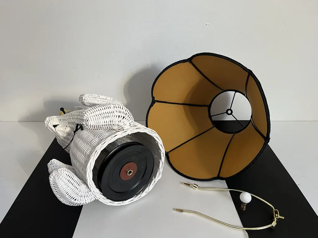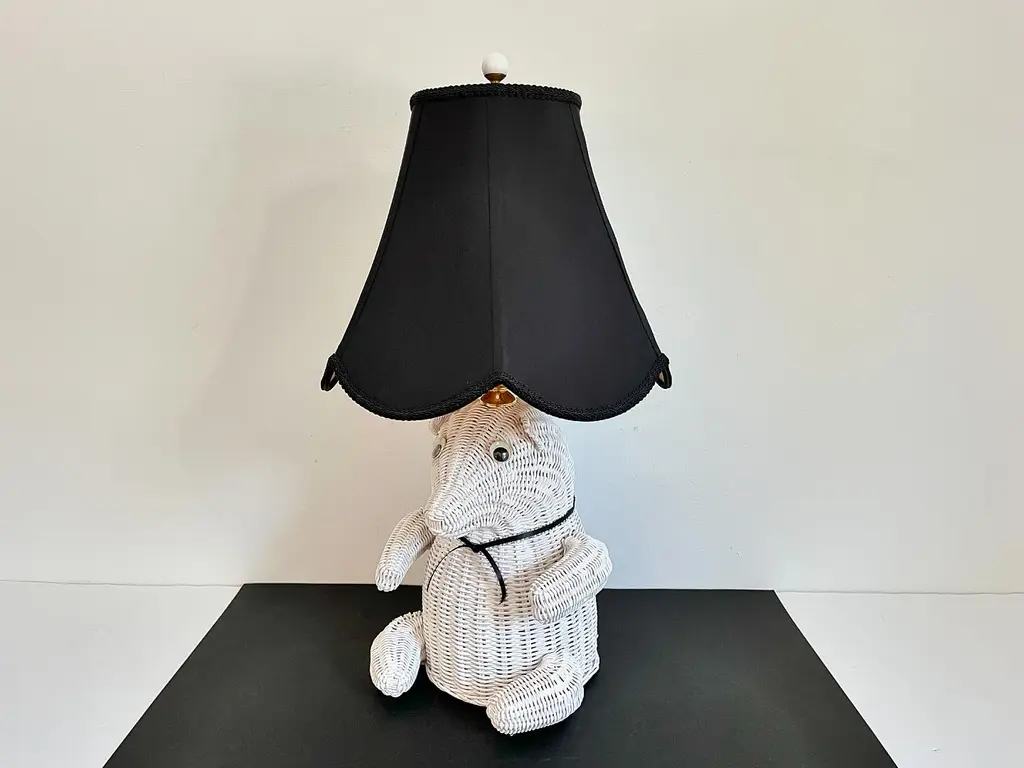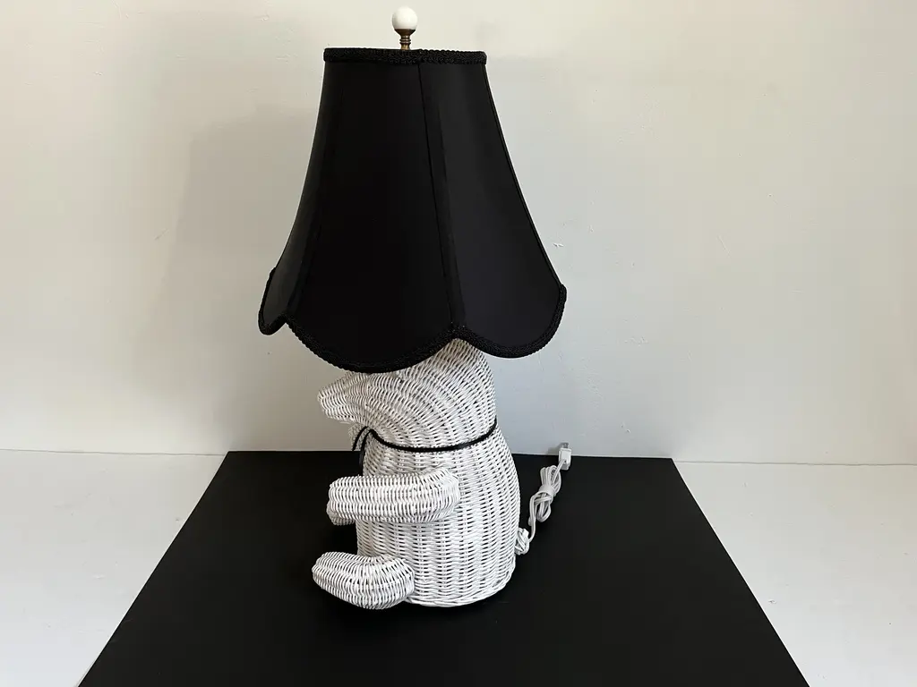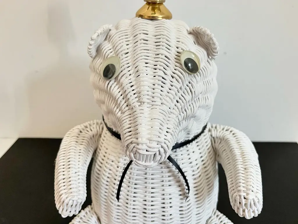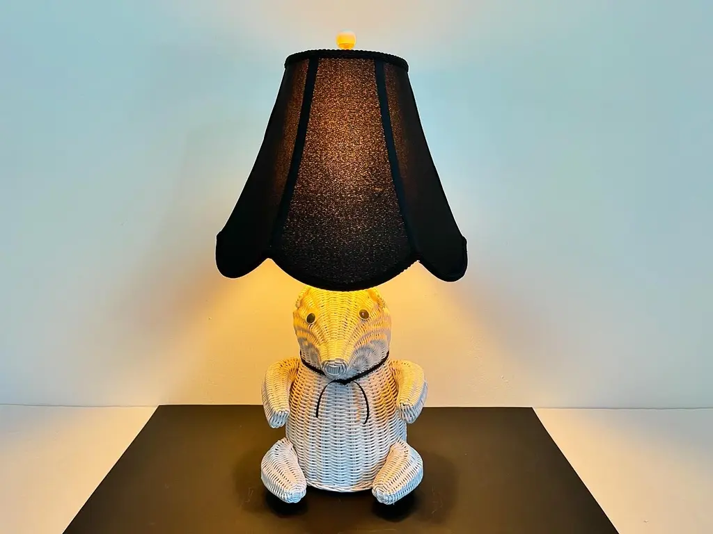 Large mid century wicker teddy bear lamp in its original white painted finish featuring a whimsical upright seated bear complete with googly eyes, ribbon necktie, and round tail. Professionally restored with all new wiring, brass fittings, new cord and plug and socket for standard bulb. New scalloped black shade, harp and vintage white marble ball finial included. Base to socket, 16.25"H. Shade, 13"W x 11"H. Bear, 10.5"W x 10"D x 12"H. Light wear.