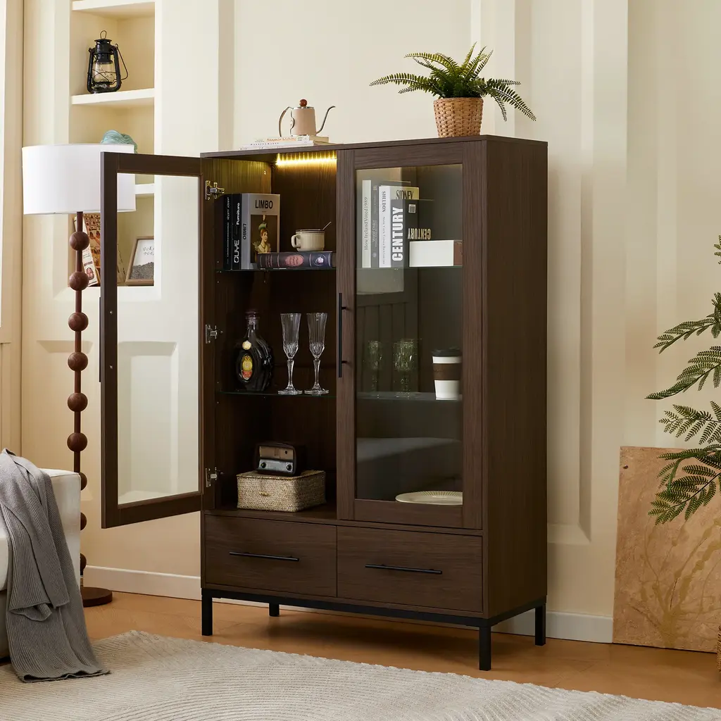 Elevate your home decor with this elegant lighted glass display cabinet. It features LED lighting, 4 adjustable glass shelves, and a tempered glass door for a sleek, modern look. The sturdy metal legs and two storage drawers provide both style and functionality. Damper hinges allow doors to be closed slowly due to the friction of viscous material inside. The high-quality metal handles offer a great tactile feel and excellent durability. The adjustable shelves can be easily adapted to suit the height of your collection, enhancing the display. Metal legs ensure stability and longevity.