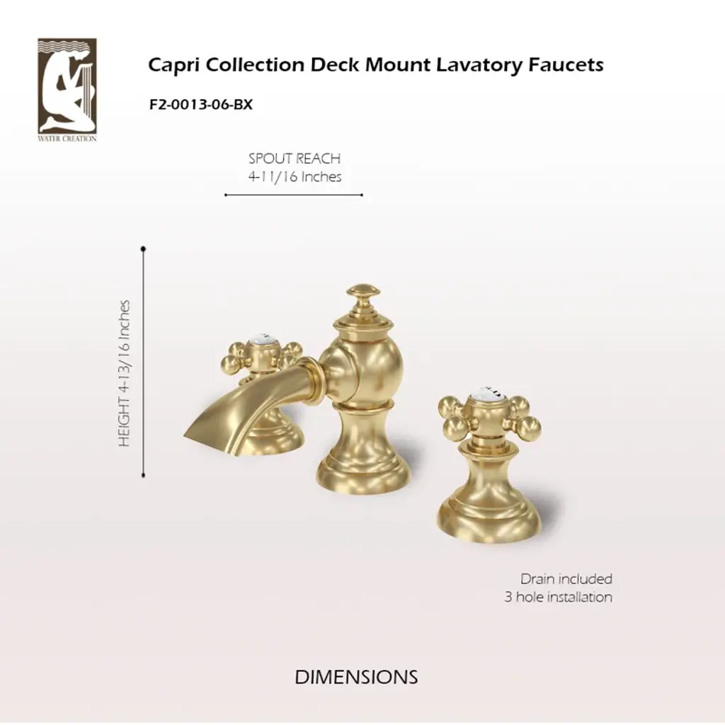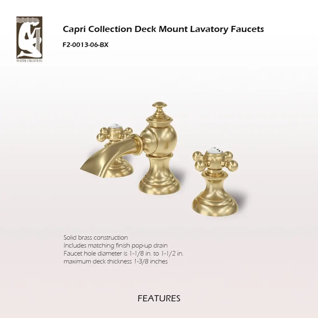 Water creations collection of premier bathroom faucets will transform any bathrooms decor to the luxury and elegance of yesteryear. The crossroads of timeless design and innovative modern manufacturing processes merge harmoniously to ensure each faucets finishes and function are as reliable as their unmistakable beauty. Made of 100% brass, the heavy weight of water creations faucets lends credence to the durability and superior craftsmanship that water creation is known for. With the understanding that no 1 customer is alike, water creation has gone the extra mile to ensure satisfaction by giving customers the power to customize the handle style of each of their vintage faucets. Simply select the style that meets your preferences and start enjoying a world-class faucet that you had a hand in creating.