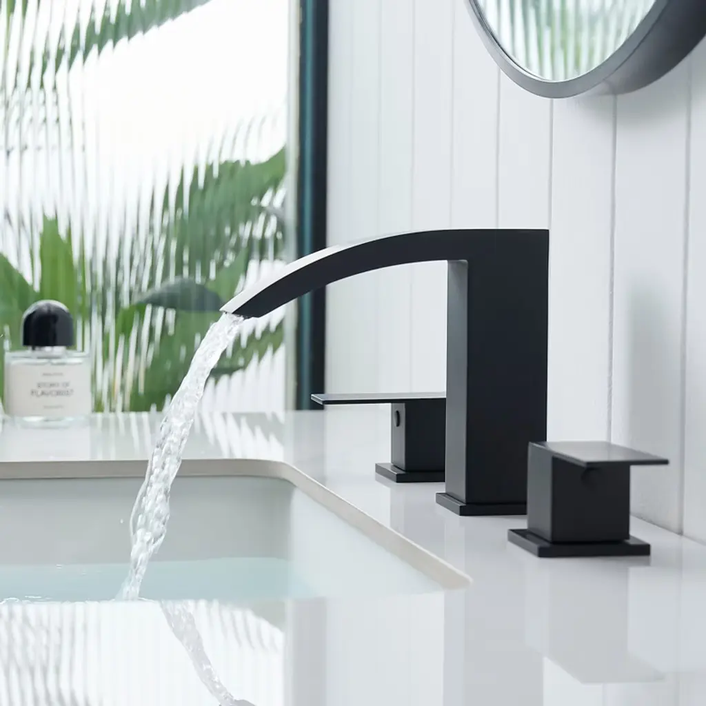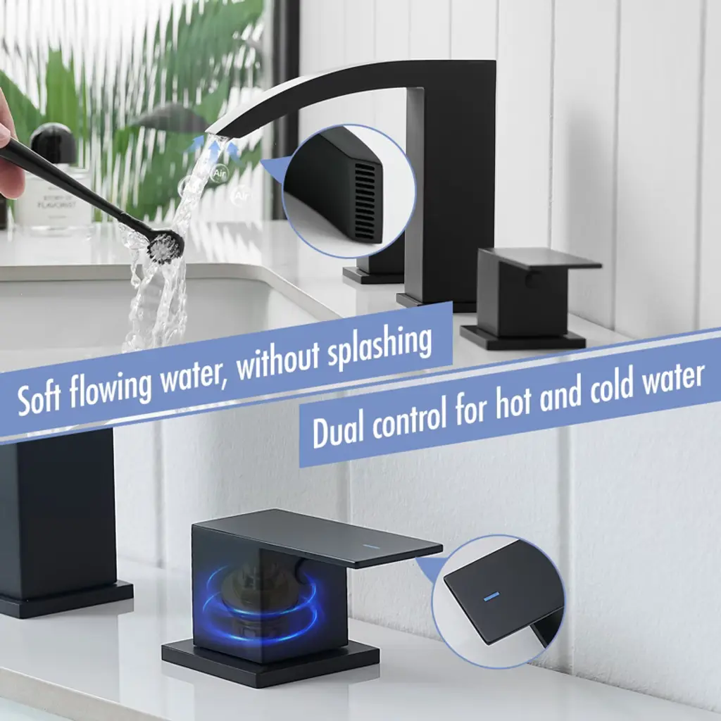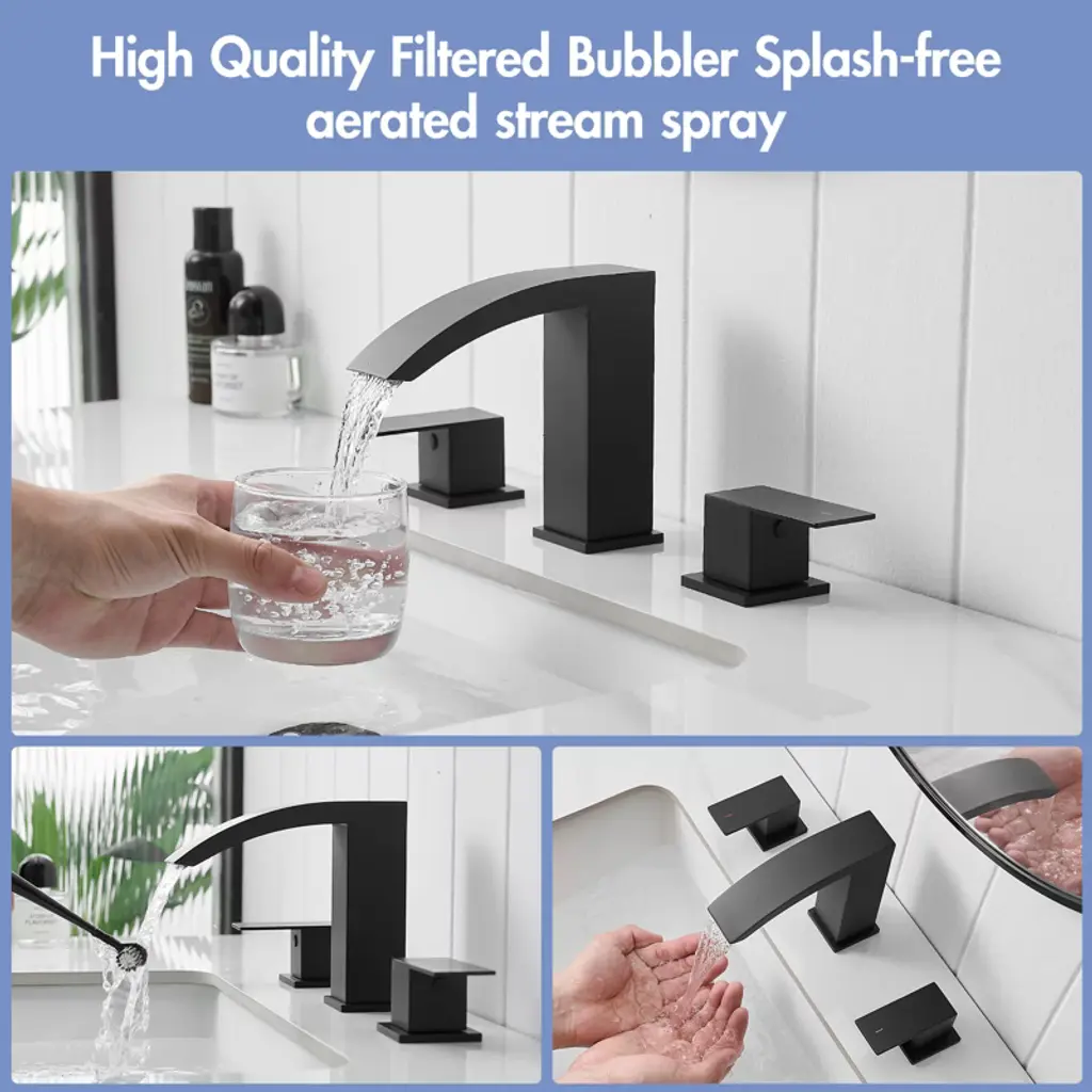 8-inch widespread nickel gold faucet with double lever handles and pop-up drain for bathroom sinks.