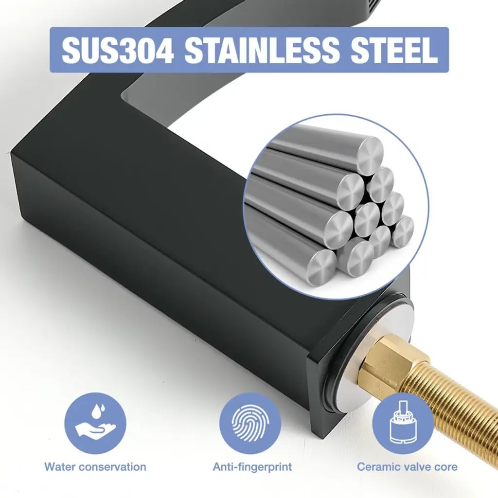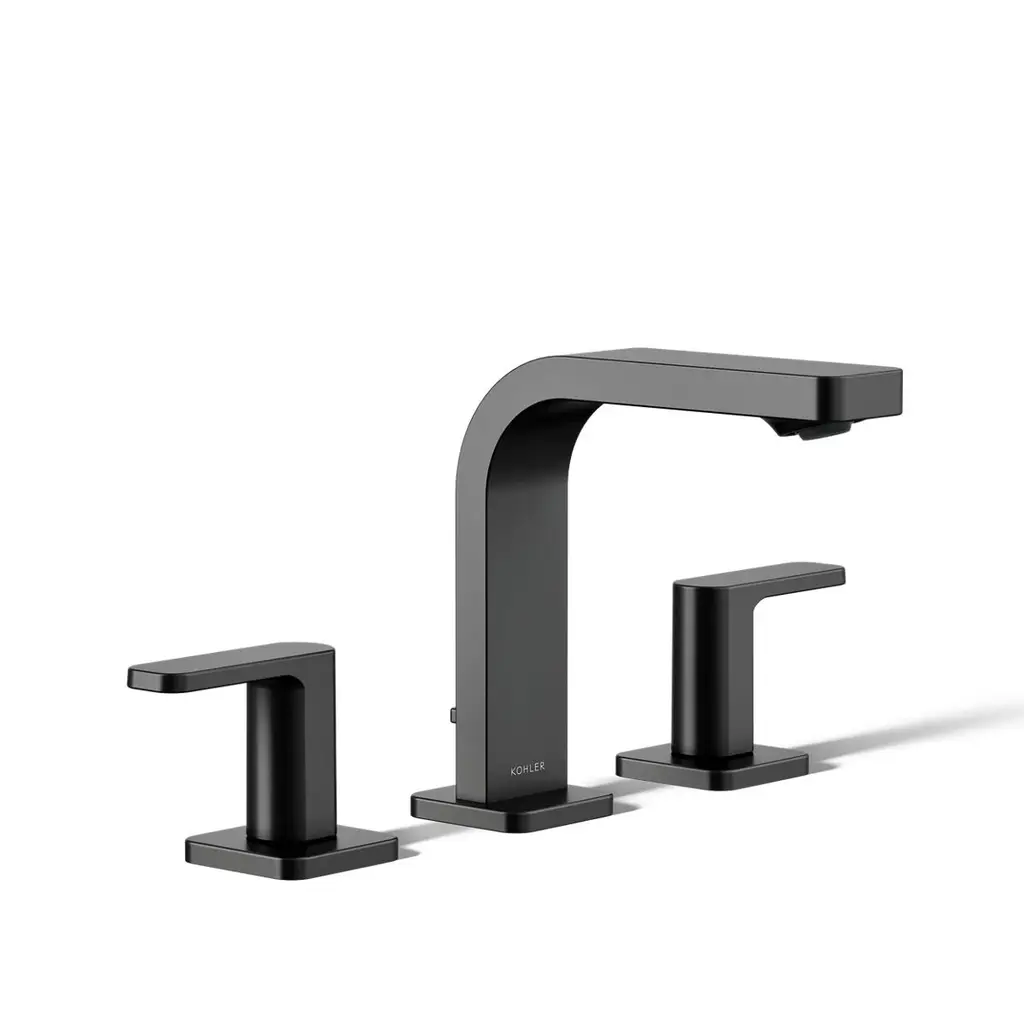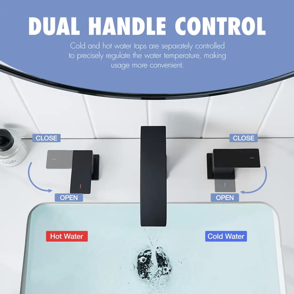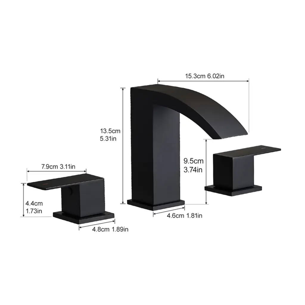8-inch widespread nickel gold faucet with double lever handles and pop-up drain for bathroom sinks.