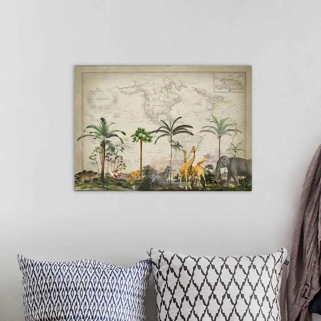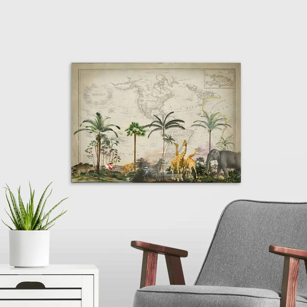 Vintage style mixed media art with old map, tropical landscape, and wild animals.