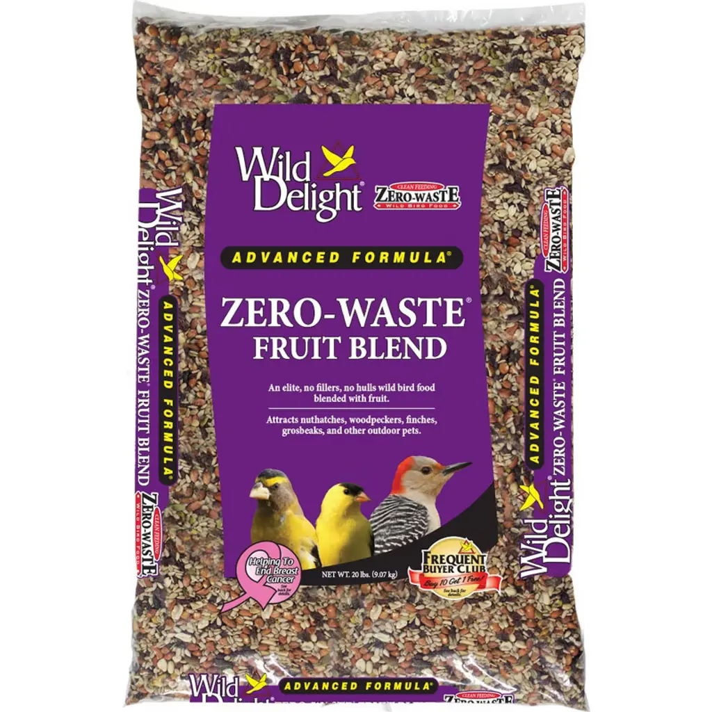 Wild Delight Zero-Waste Fruit Blend will attract lots of birds to your backyard! An elite, zero-waste wild bird food blended with fruit to attract the most desired outdoor pets and give you a clean feeding experience. Contains real fruit, real nuts, premium seeds, added vitamins and minerals, electrolytes, amino acids, no corn/milo/millet, and no chemical preservatives. Wild Delight Advanced Formula products have been formulated with added nutrients to help ensure that birds and other wildlife maintain high levels of health. The nutrients in the points listed are added to every Wild Delight Advanced Formula. Attracts a wide variety of birds including nuthatches, woodpeckers, finches, grosbeaks, and other outdoor birds. You will receive a 5-pound bag.
