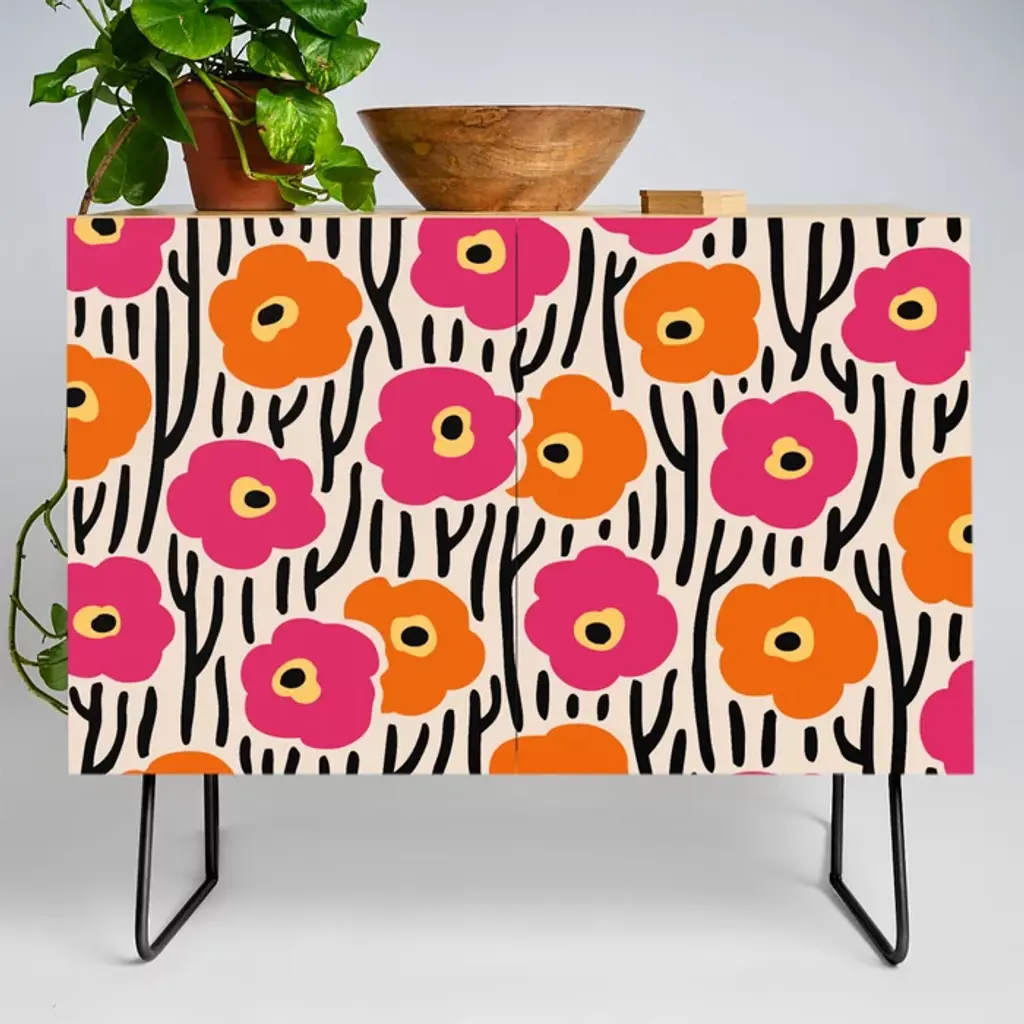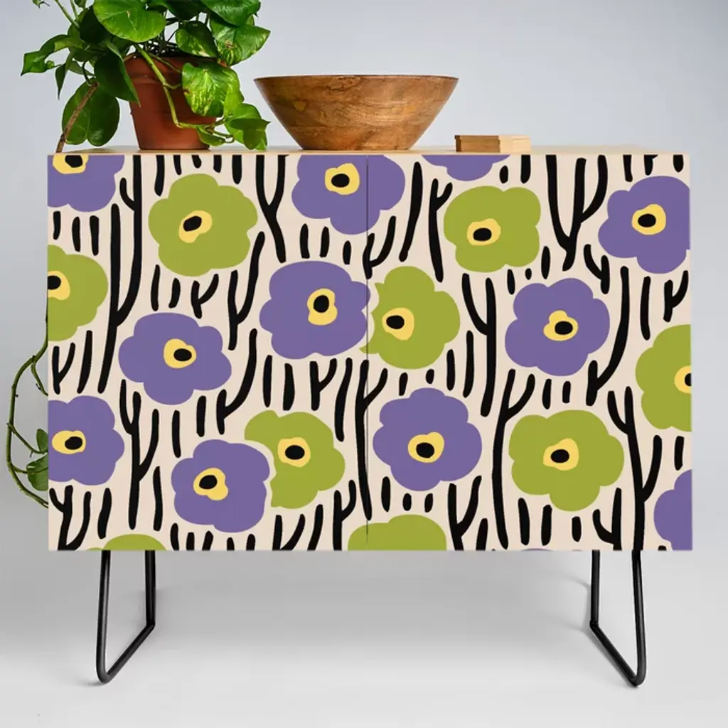 Wild Flowers Pattern Turquoise And Yellow Credenza