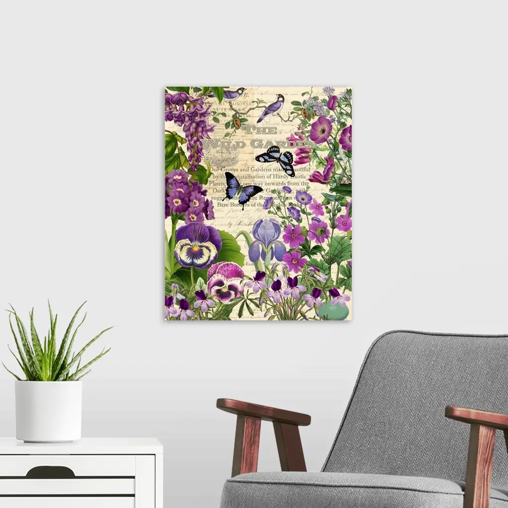 Vintage illustrations of pansies and butterflies arranged in a garden scene.