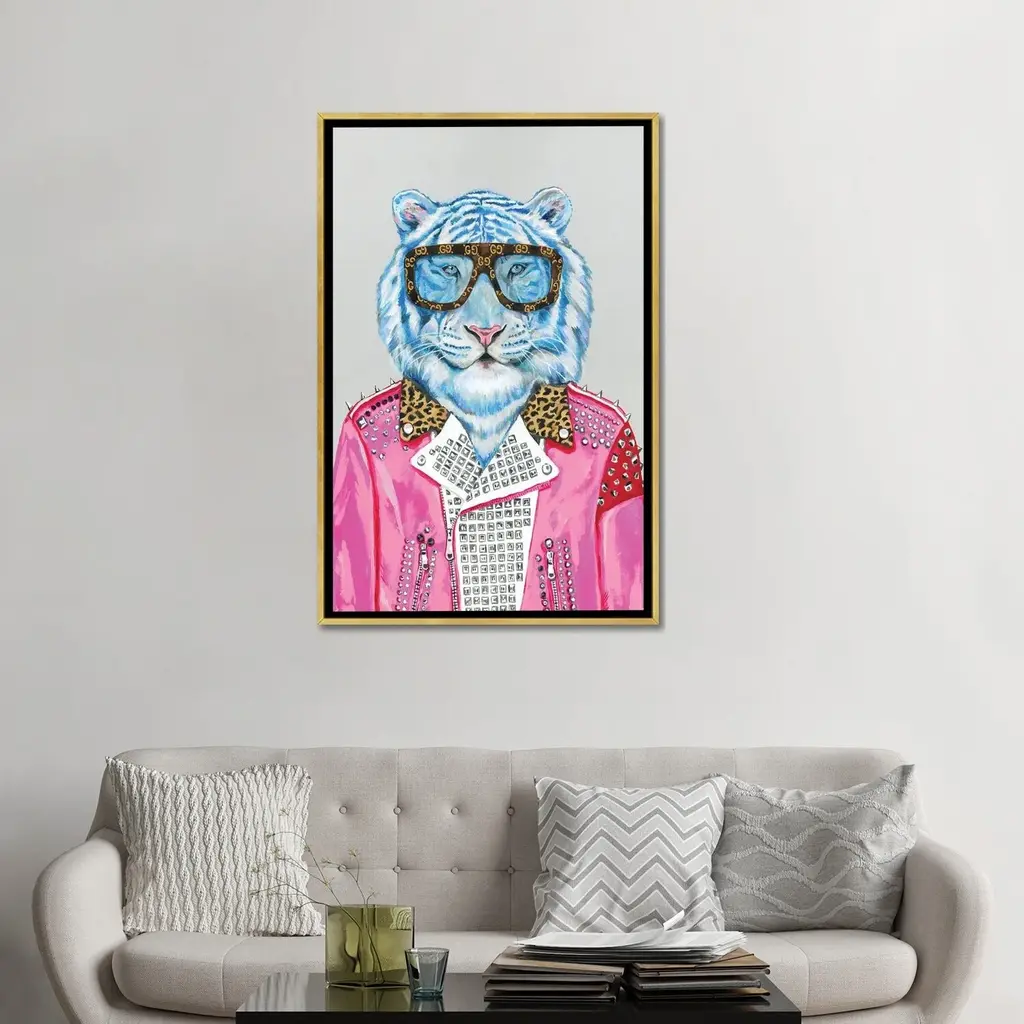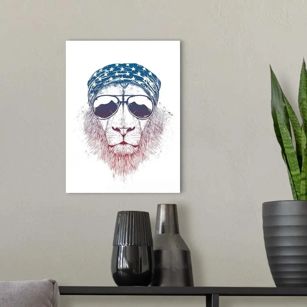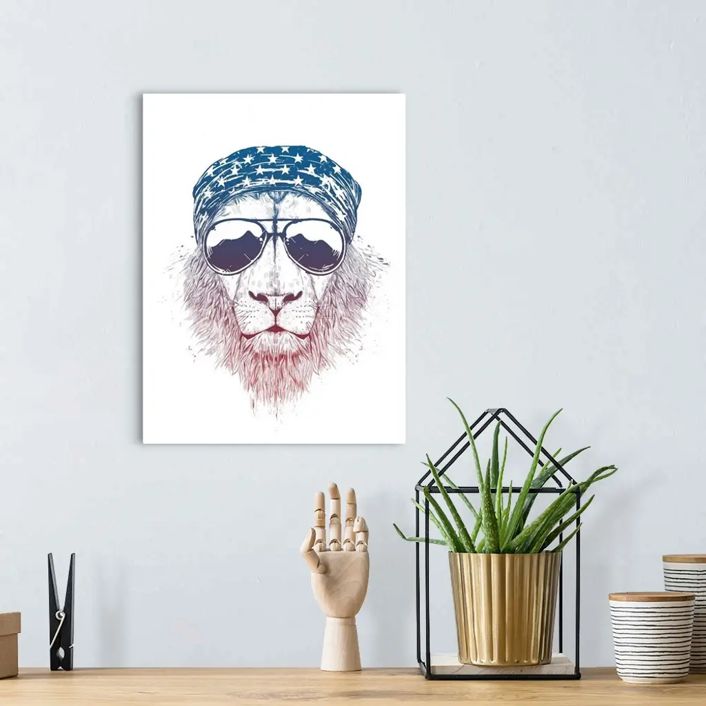 Portrait of lion wearing aviator sunglasses and a star spangled bandana.