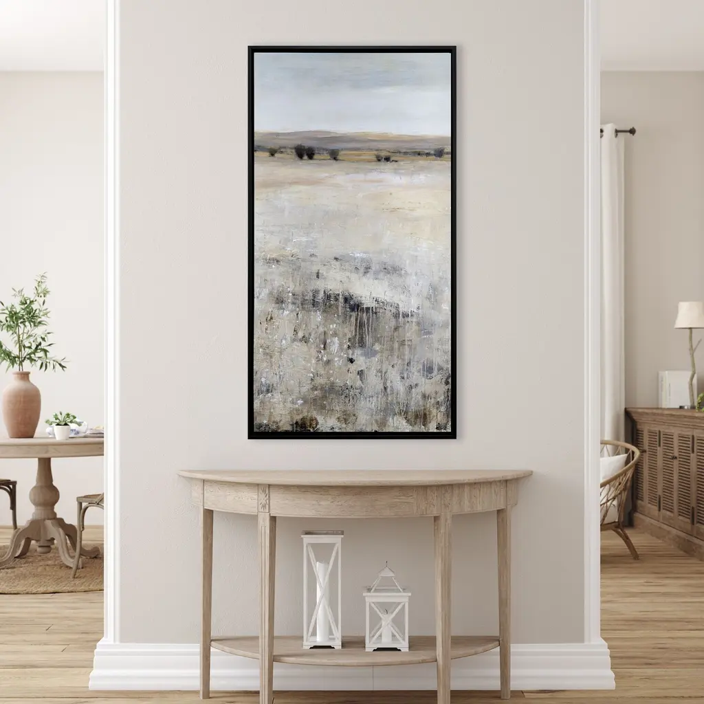 An endless landscape reaches out toward a distant horizon in muted shades of blue and gray. The canvas is mounted in a satin black floater frame.