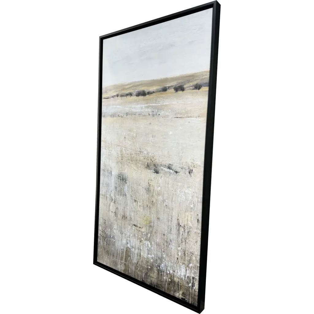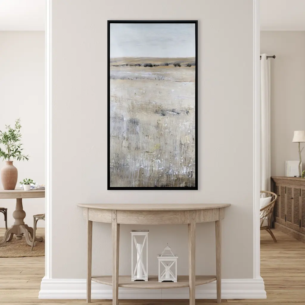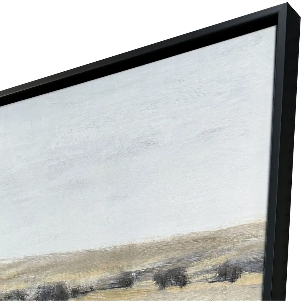 An endless landscape reaches out toward a distant horizon in muted shades of blue and gray. The canvas is mounted in a satin black floater frame.