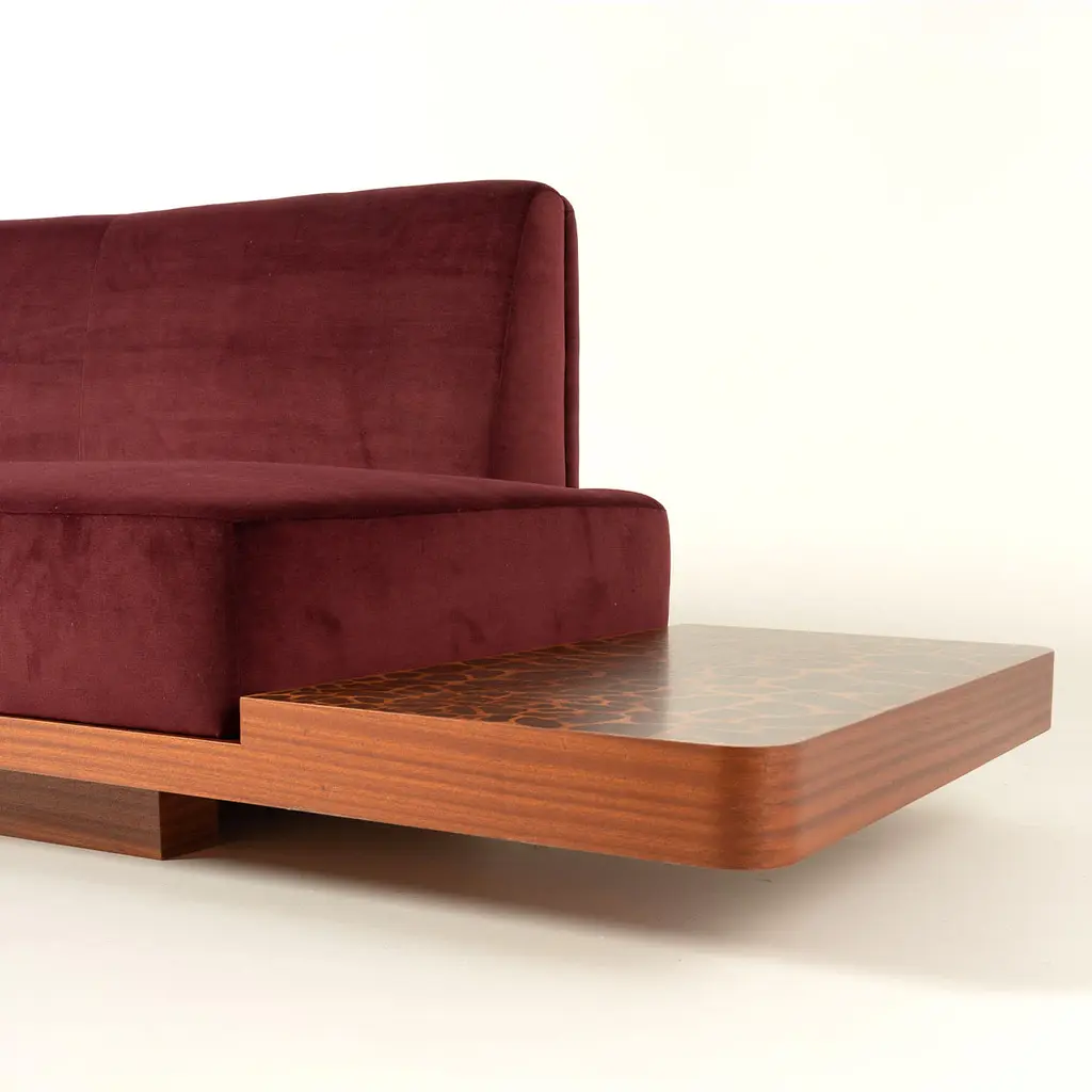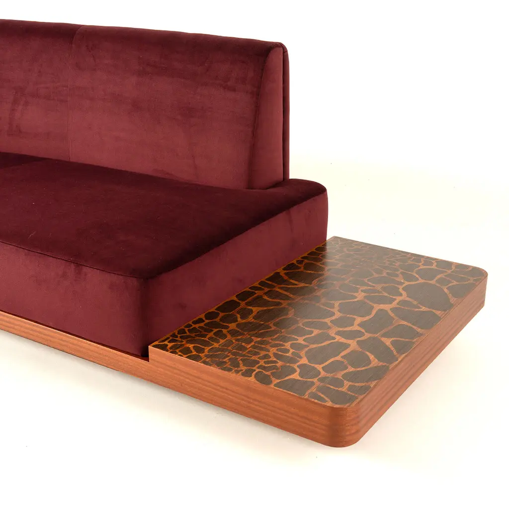 Wild Side Curved Red Wine Sofa with Table by Lorenza Bozzoli features a gently curved design upholstered in soft velvet with a deep red wine tone. The solid mahogany base provides stability and extends into a built-in low table with an eye-catching giraffe-effect inlay, adding an exotic, artistic touch. This piece blends comfort and distinctive design for a striking seating option.