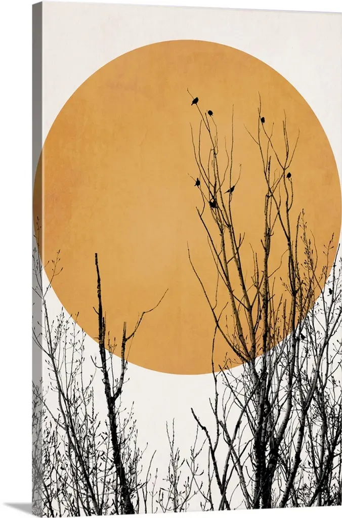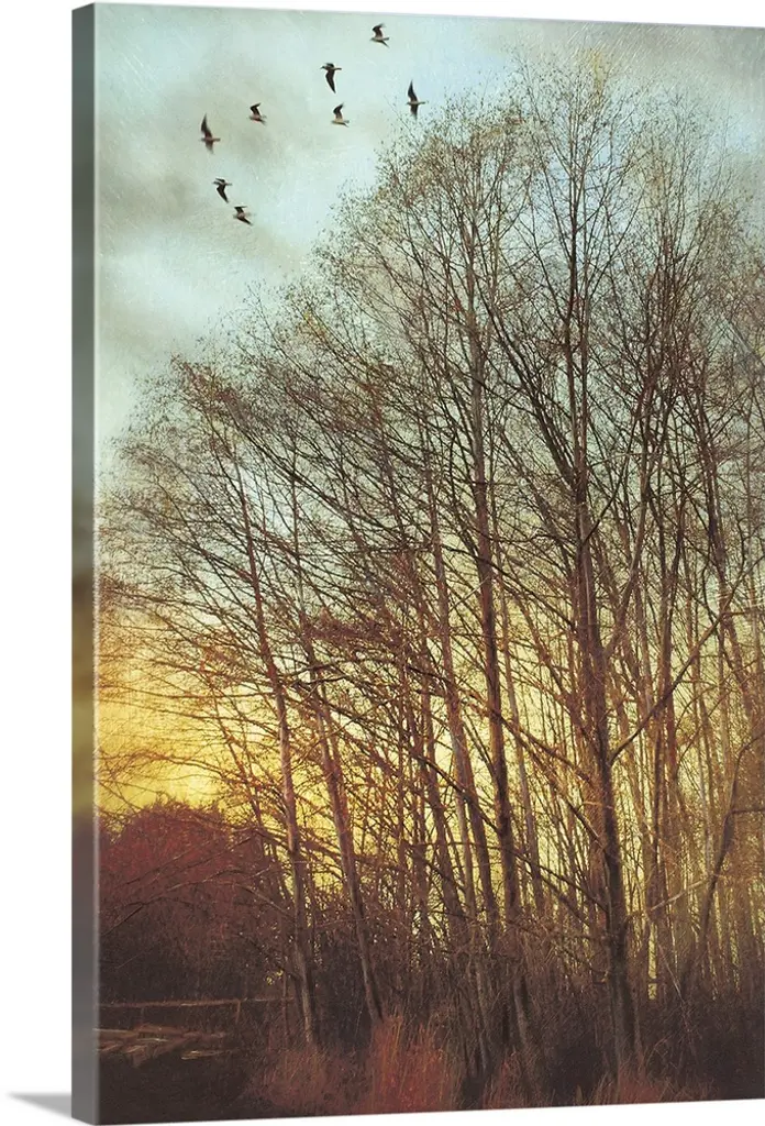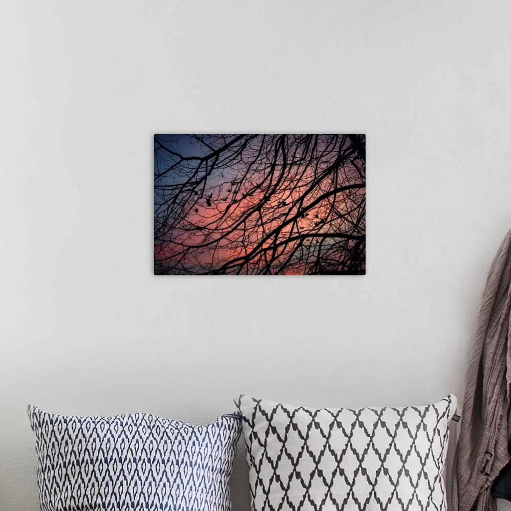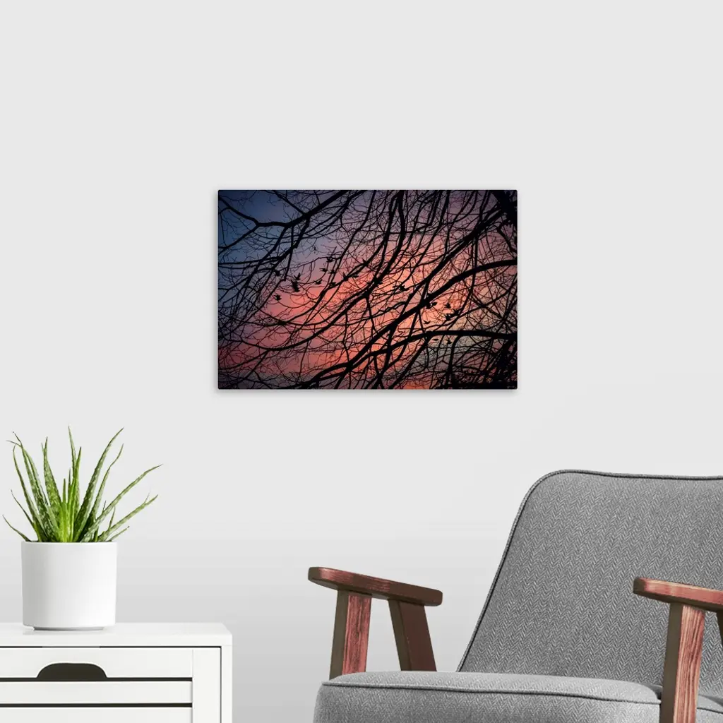Silhouetted tree branches intertwine against a vibrant twilight sky, creating a striking and intricate pattern. Birds are perched on the branches, adding a sense of life and movement to the tranquil scene.