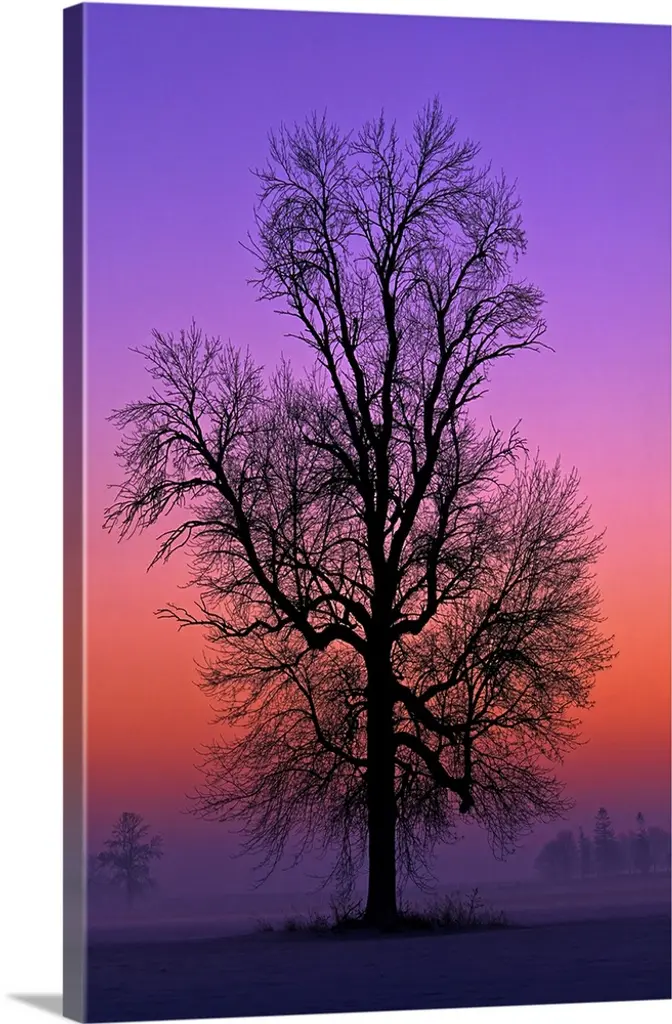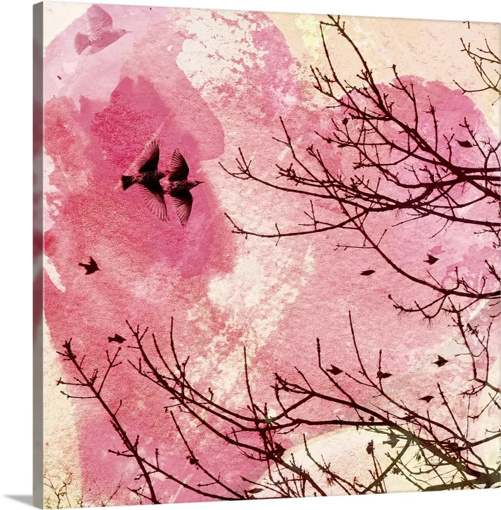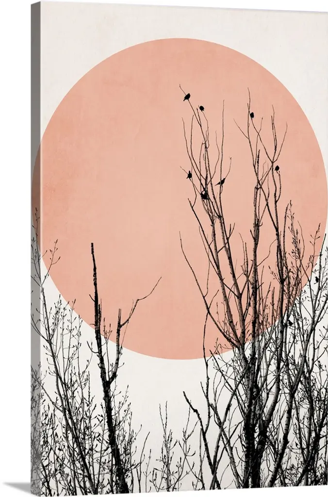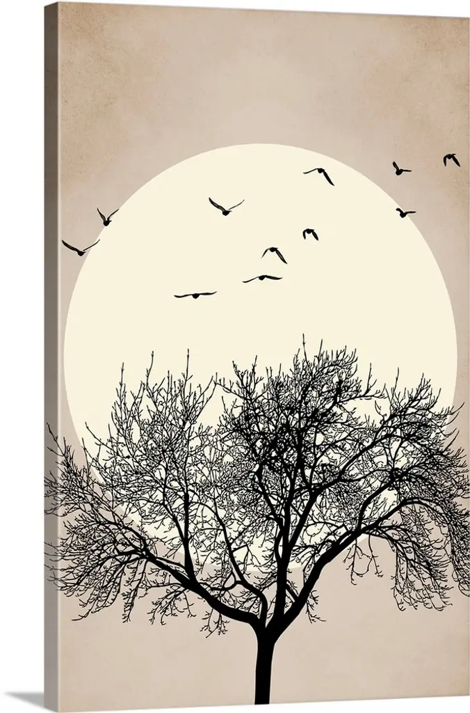 Silhouetted tree branches intertwine against a vibrant twilight sky, creating a striking and intricate pattern. Birds are perched on the branches, adding a sense of life and movement to the tranquil scene.