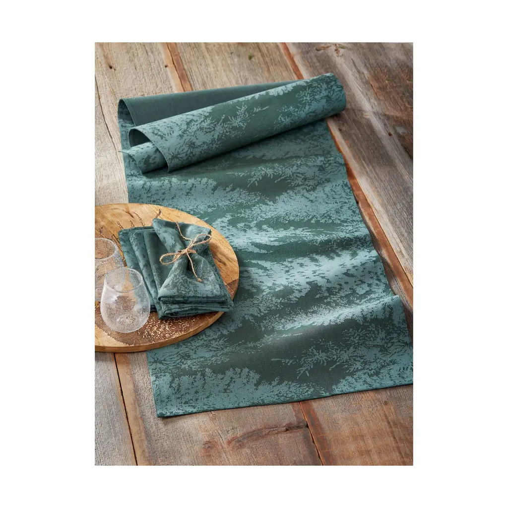 this green jacquard table runner is the perfect way to add a touch of elegance and sophistication to your holiday decor. the table runner is made from high-quality jacquard fabric, which is woven with a beautiful tree design in a rich green color. a stylish and functional addition to your tablescaping essentials this season! 100% cotton construction, this runner features hand screen printed textured weave. extremely versatile—relaxed enough for casual affairs, yet luxe and refined for more elegant soirees.a stylish and functional addition to your tablescaping essentials this season! 100% cotton construction, this runner features hand screen printed textured weave. extremely versatile—relaxed enough for casual affairs, yet luxe and refined for more elegant soirees.QUALITY MATERIAL: 100% cottonCARE AND USE INSTRUCTIONS:machine wash cold separately, line dry
