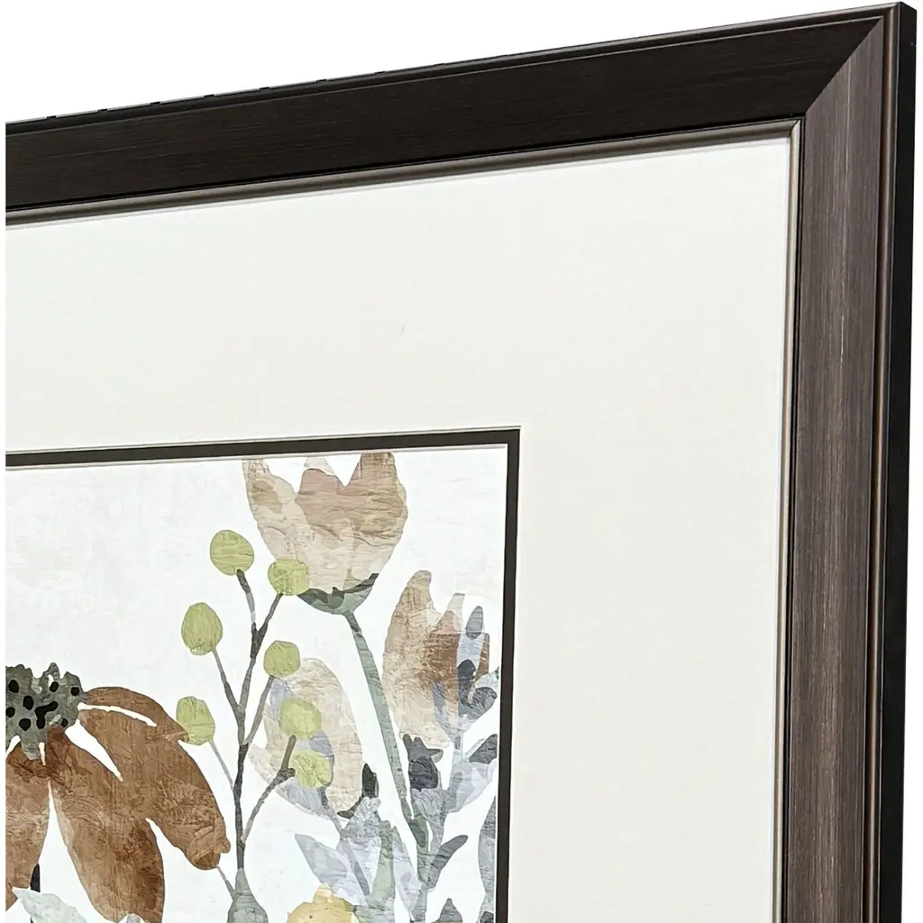 A wildflower garden in autumn colors is matted in light buff and dark brown. Framed in a metallic bronze finish moulding with a pewter lip.