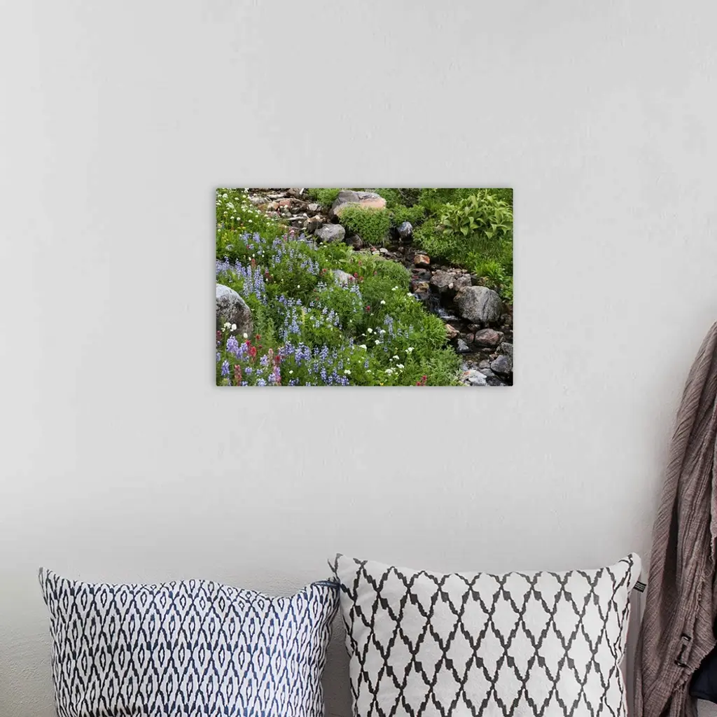Wildflowers, rocks and a small flowing stream in a landscape on Mount Rainier.