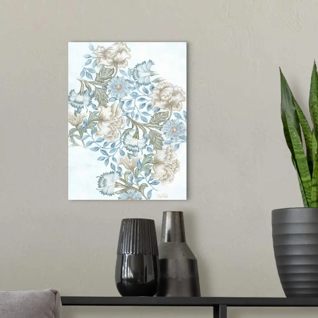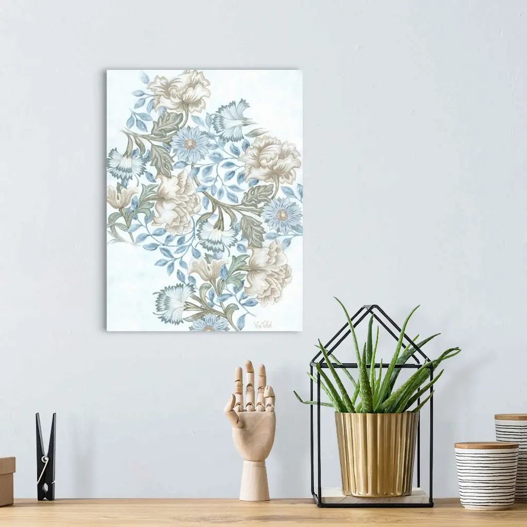 A white background accentuates the elegance of white and blue flowers in this tranquil composition.