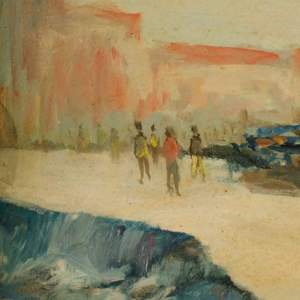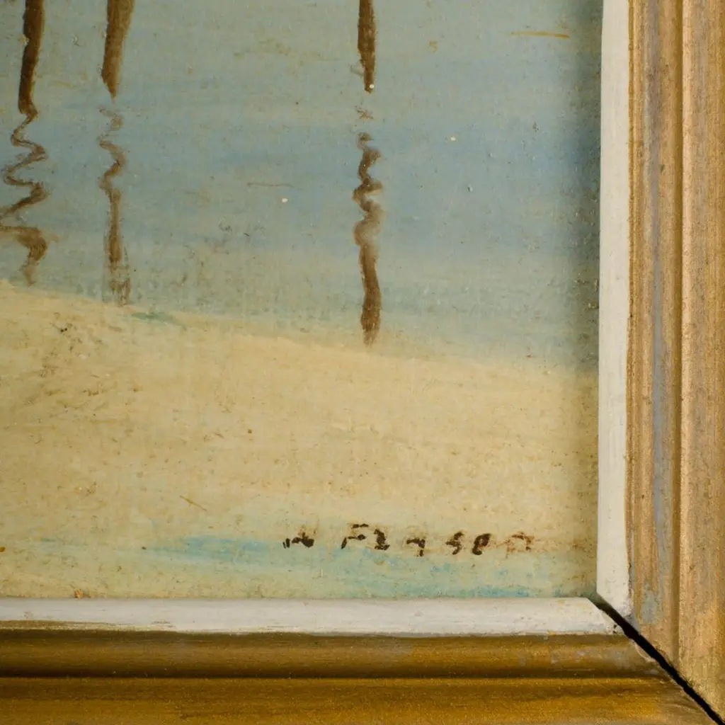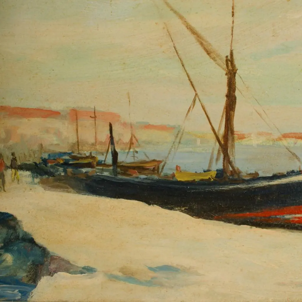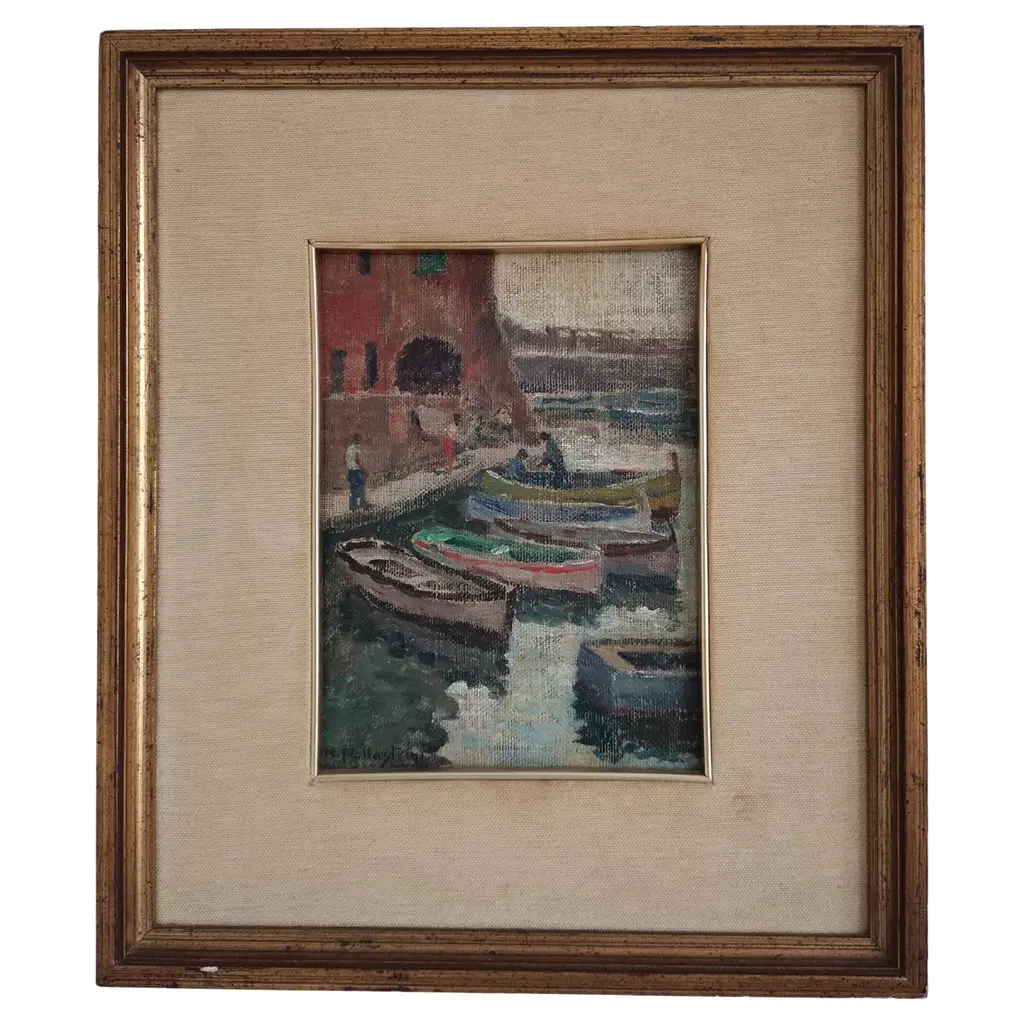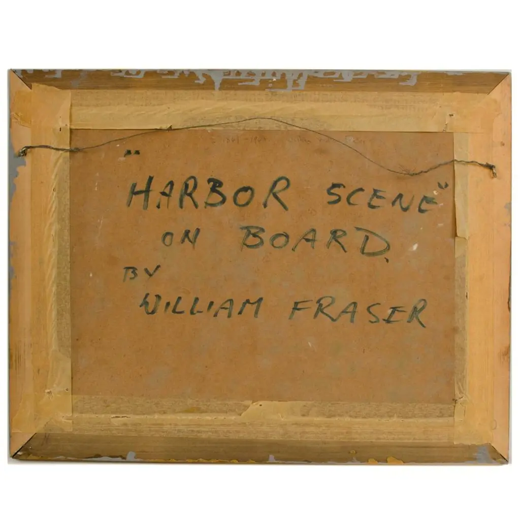 Black sailboat in harbor with red stripe - Oil on board, signed lower right - Framed dimensions: 19.25 in x 15.25 in.