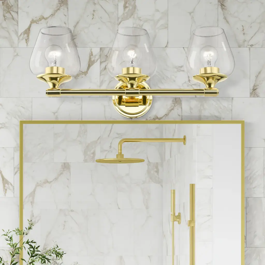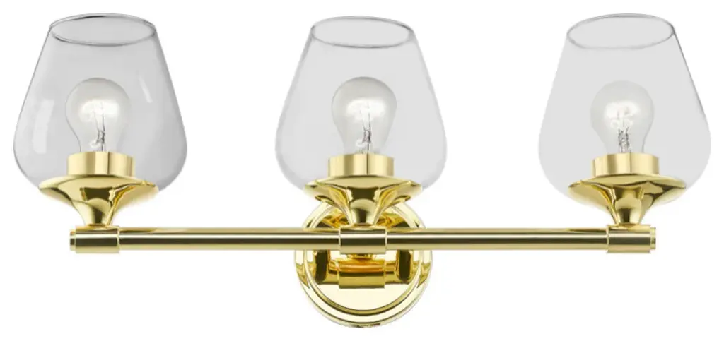 This three light vanity sconce from the willow collection has understated elegance. It features minimal details, clear curved glass with a polished brass finish and can fit into any decor.Bulb Wattage: 60Number of Bulbs: 3Type of Bulb: Medium BaseBulbs Included: N