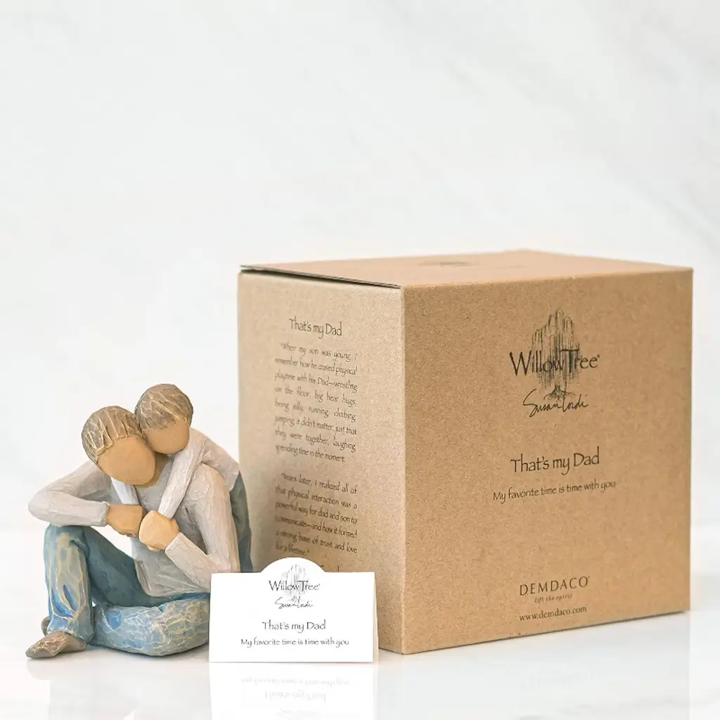 Willow Tree — That’s My Dad is a touching figurine that celebrates the special bond between a father and his child. Featuring a father seated on the ground with his young child resting comfortably beside him, it captures a quiet moment of connection, security, and love. This piece is an ideal gift for Father’s Day, birthdays, or simply to honor the deep relationship between a dad and his child
