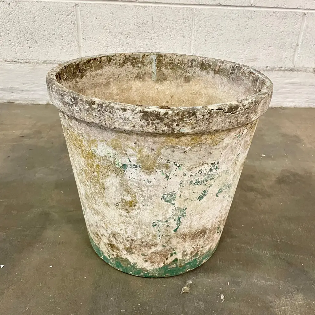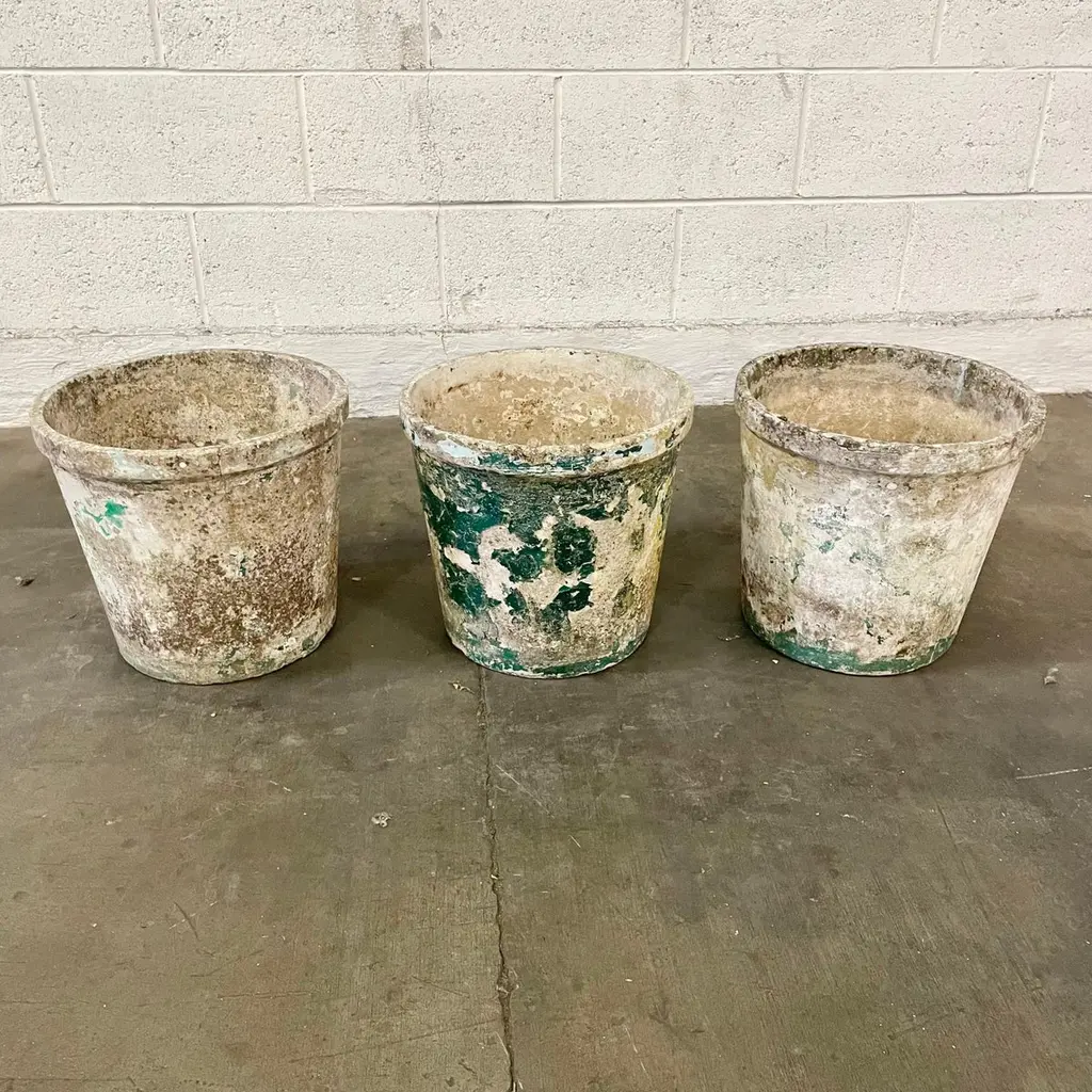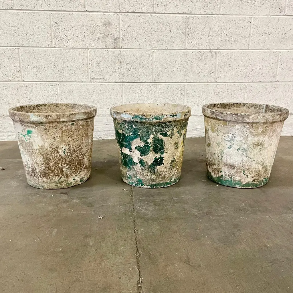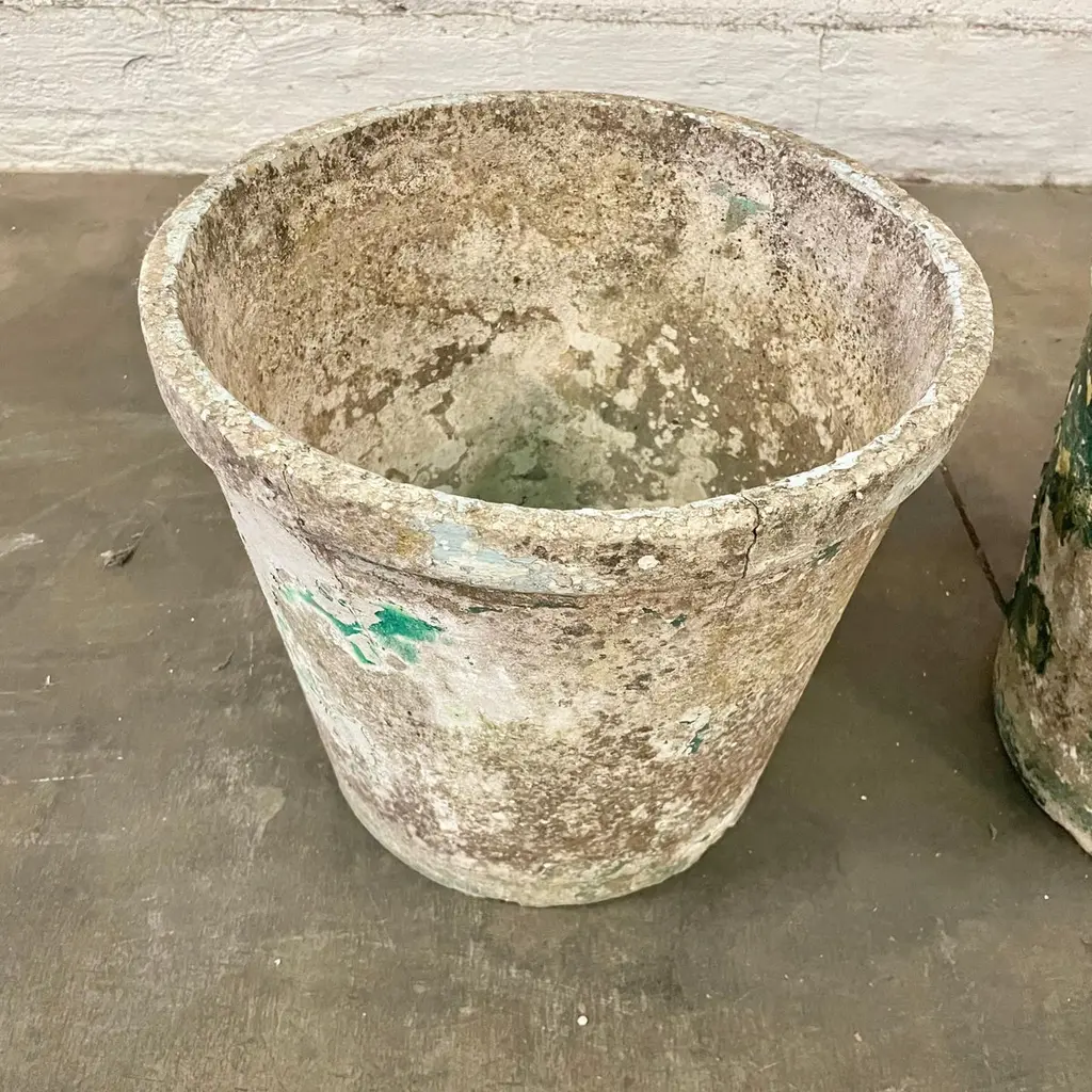 Perfect large concrete flower pots by Willy Guhl. Made in Switzerland in the 1960s. Great vintage condition with unique patina on each as shown. Classic flower pot design with large basin and banded lip at the top. 3 available. Priced individually.