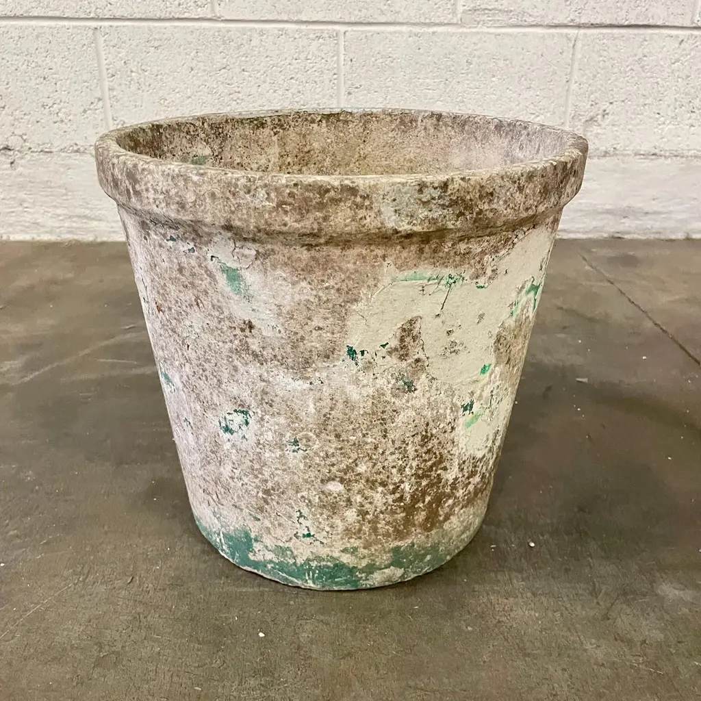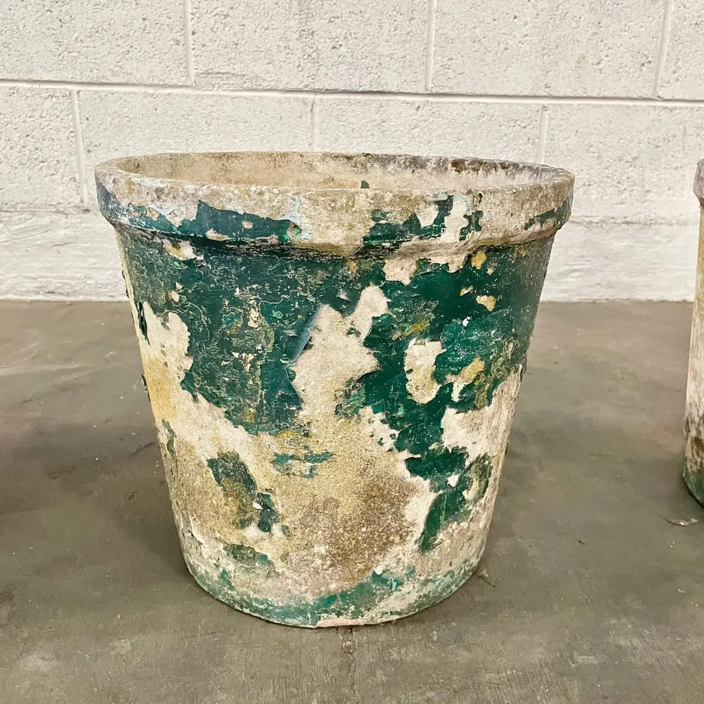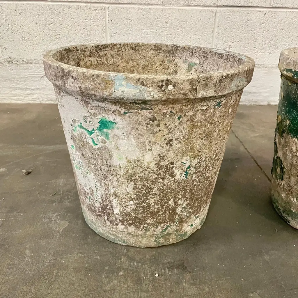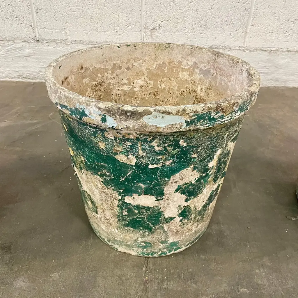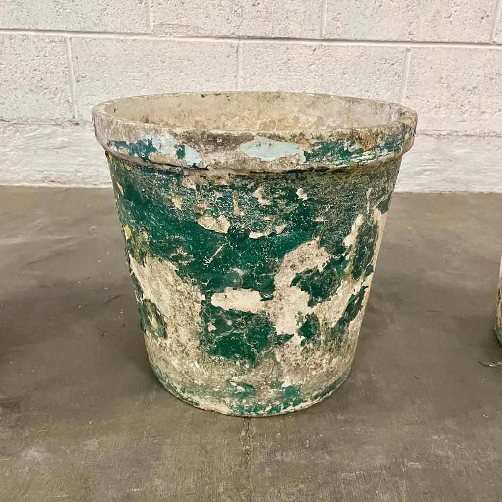 Perfect large concrete flower pots by Willy Guhl. Made in Switzerland in the 1960s. Great vintage condition with unique patina on each as shown. Classic flower pot design with large basin and banded lip at the top. 3 available. Priced individually.