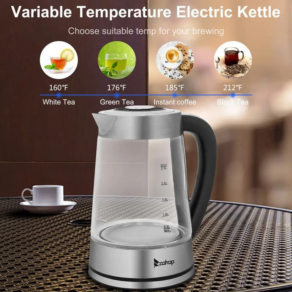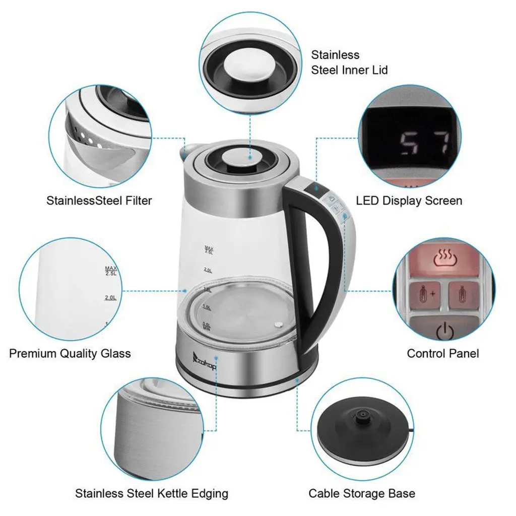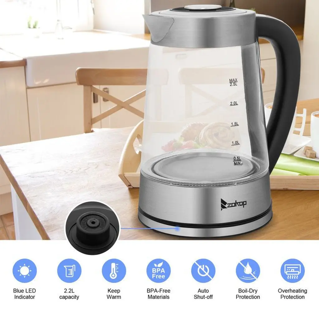 The 2.2L 110V 1200W Glass Electric kettle is the perfect combination of elegance and functionality.Not only is this kettle a beautiful addition to any kitchen counter top, but it can also boil water efficiently, saving time and energy than using a traditional stove kettle. Their unique, modern and stylish design looks great on any countertop and comes in 1 striking color.When used, a ring of LED lights will beautifully illuminate the pot, so it is not only practical, but also very attractive in appearance.After a few minutes, the hot water can be used to make instant coffee, tea, hot cereal, instant macaroni, soup, or oatmeal.