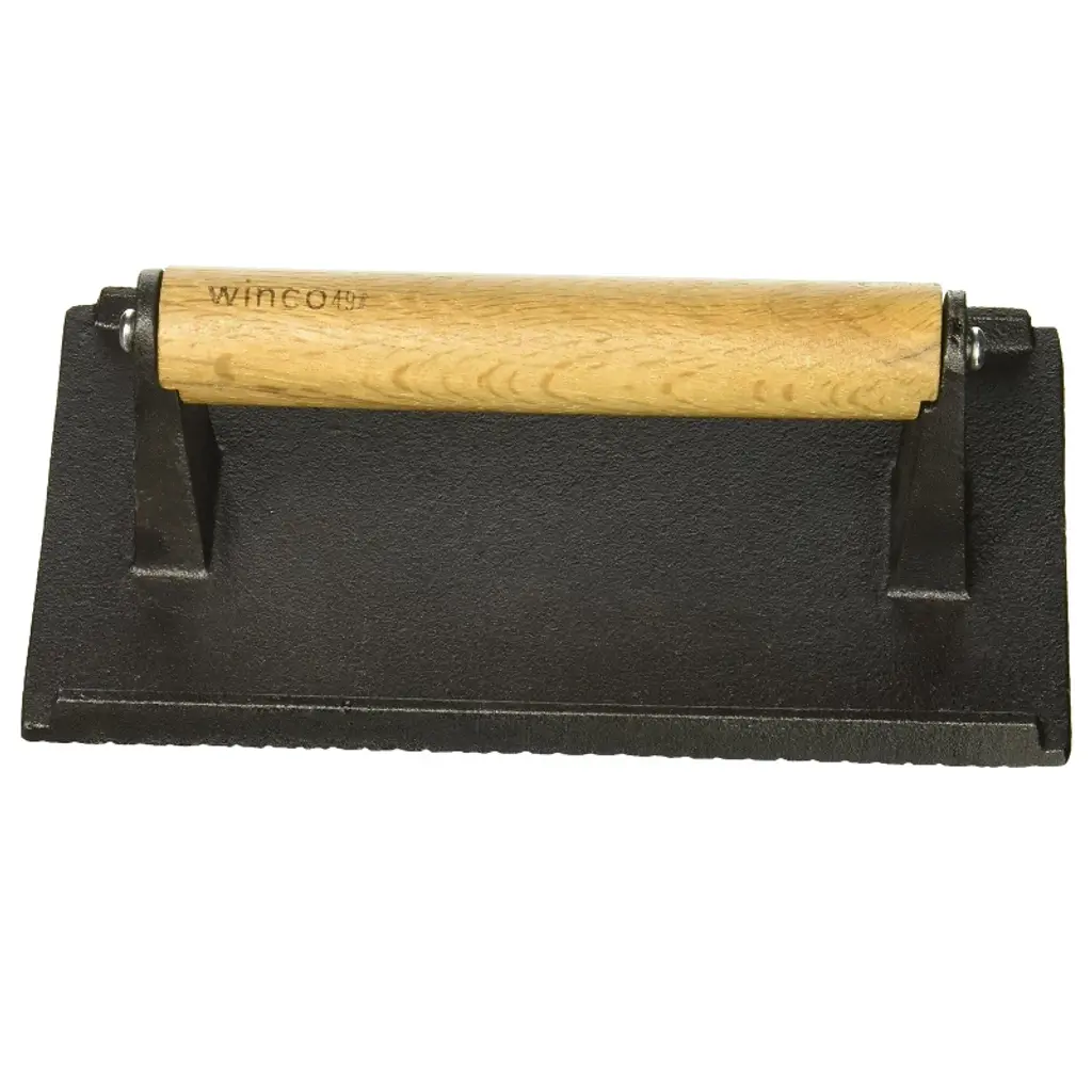 The Winco SWA-2 is a rectangular steak weight. Remove unwanted fat from your meat and poultry using this 2 pound steak weight. The cast iron flat surface that presses down on meat for thorough and even cooking. There is also a wood handle so the weight can be safely lifted from hot surfaces.
