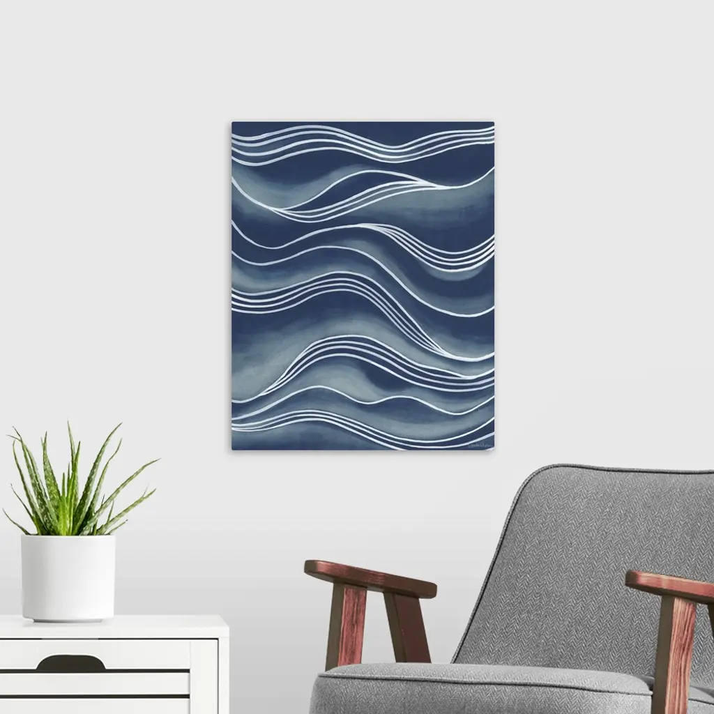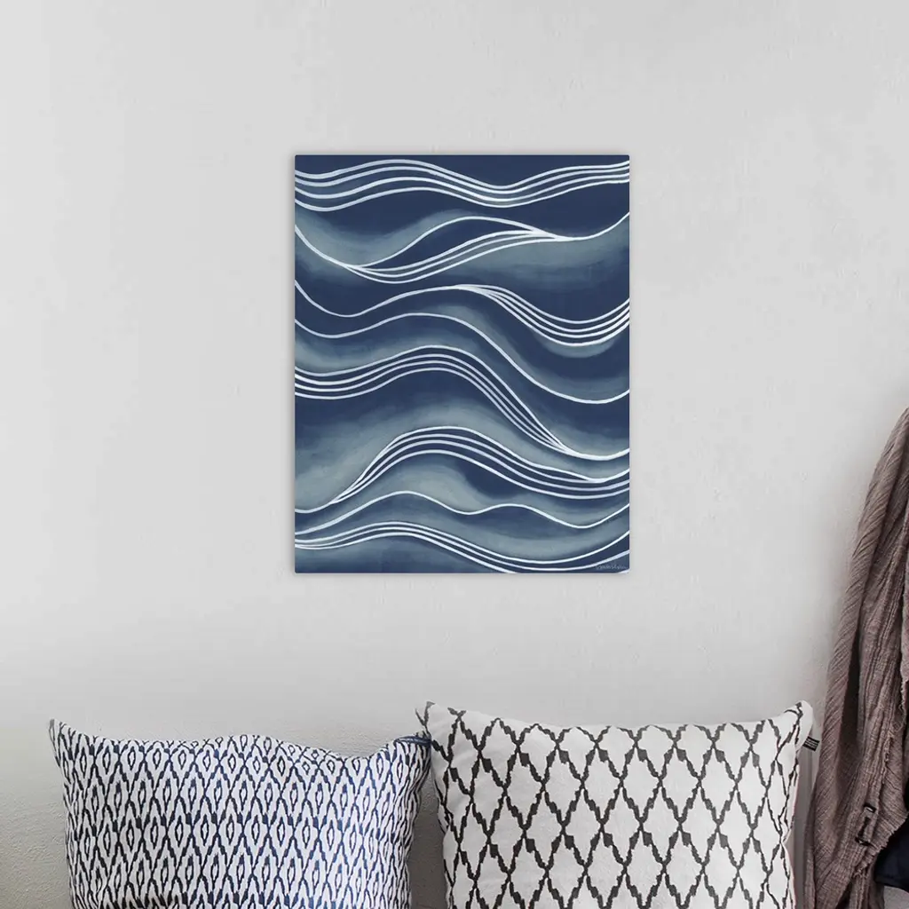 Wavy white lines over shades of blue create the illusion of rolling waves.
