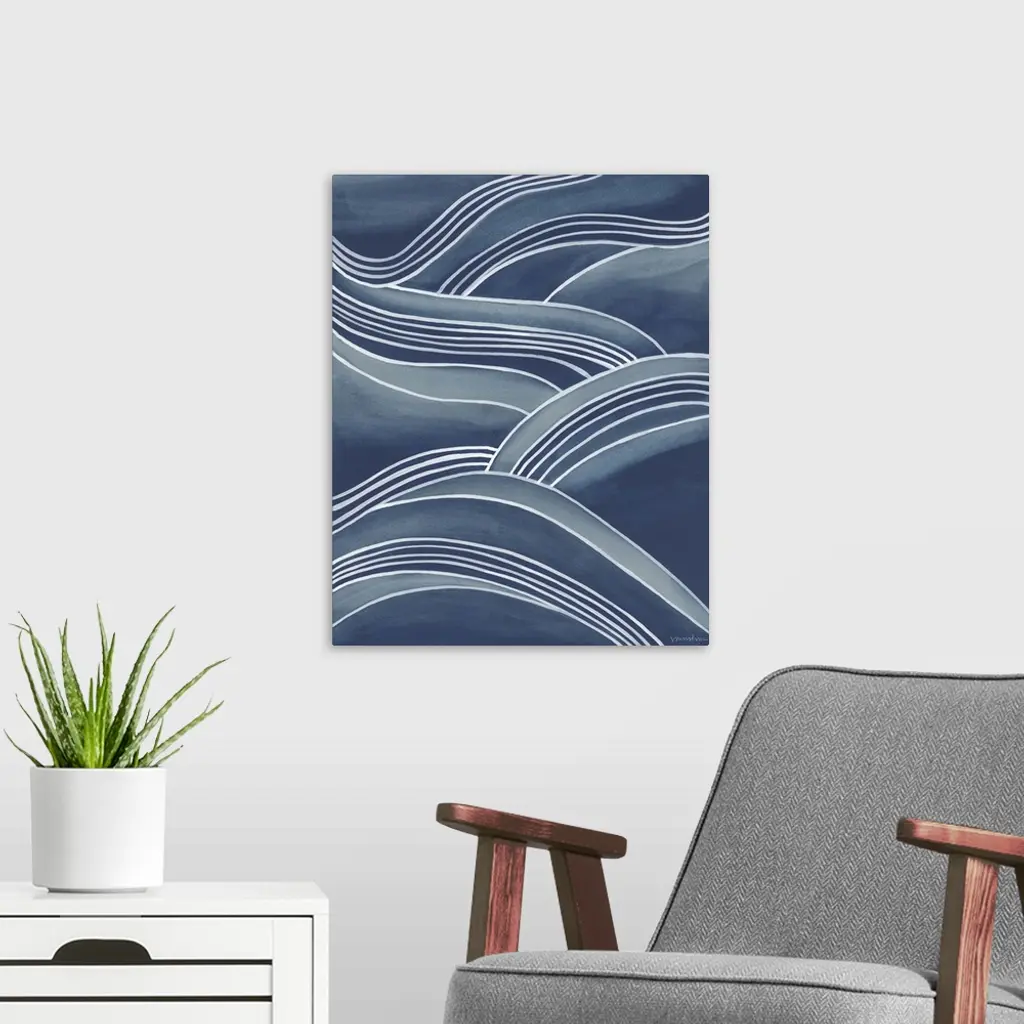 Wavy white lines over shades of blue create the illusion of rolling waves.