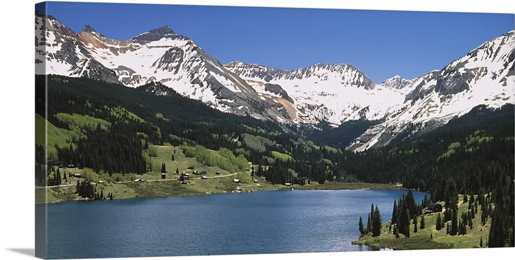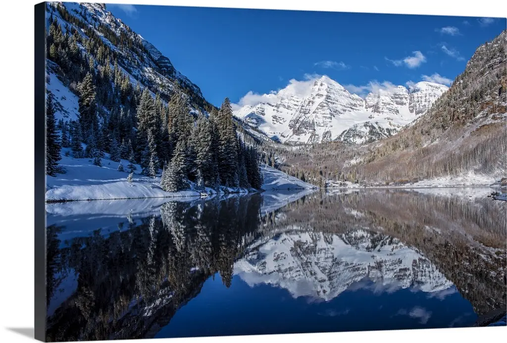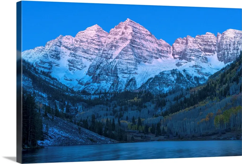 Wind-blown snow on the peaks of the Maroon Bells under a blue sky in Aspen, Colorado.